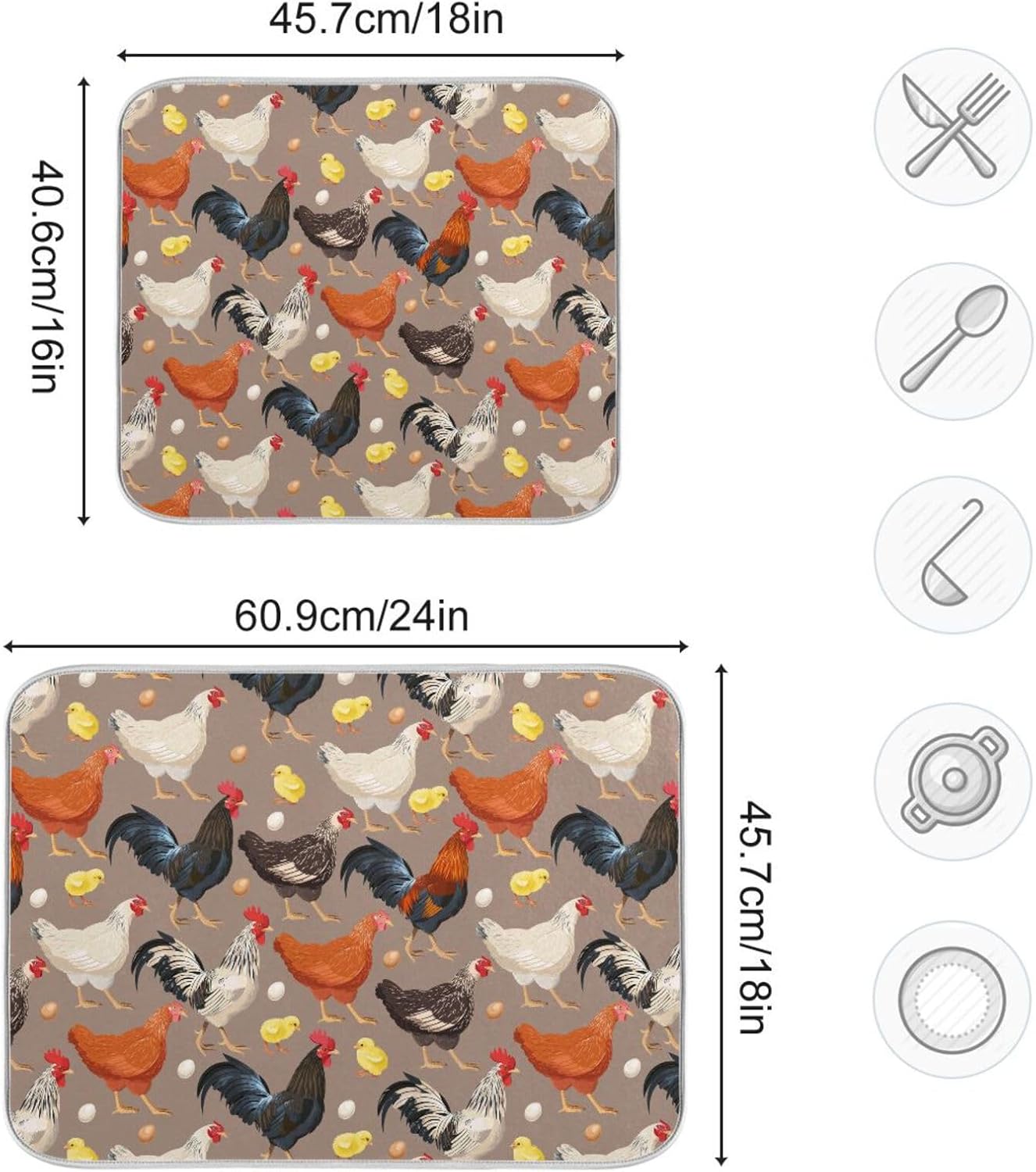 Hens Roosters Chicken Dish Drying Mat for Kitchen Counter Absorbent Microfiber Drying Pad, Large 18x24 in, Reversible Drainer Mats