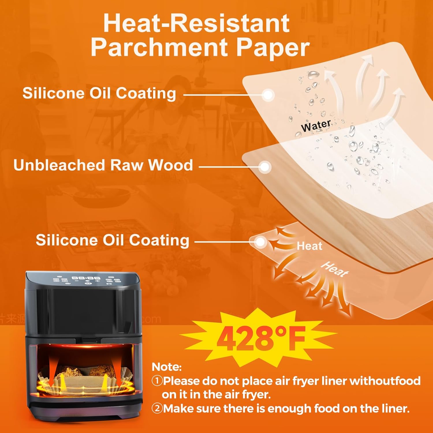- Food Grade Materials: Made of food grade parchment, with a plant based oil treatment, our air fryer liners disposable is unbleached, BPA-free, PFAs-free, water-proof, oil-proof, non-stick, heat-proof that can withstand temperatures up to 428°F