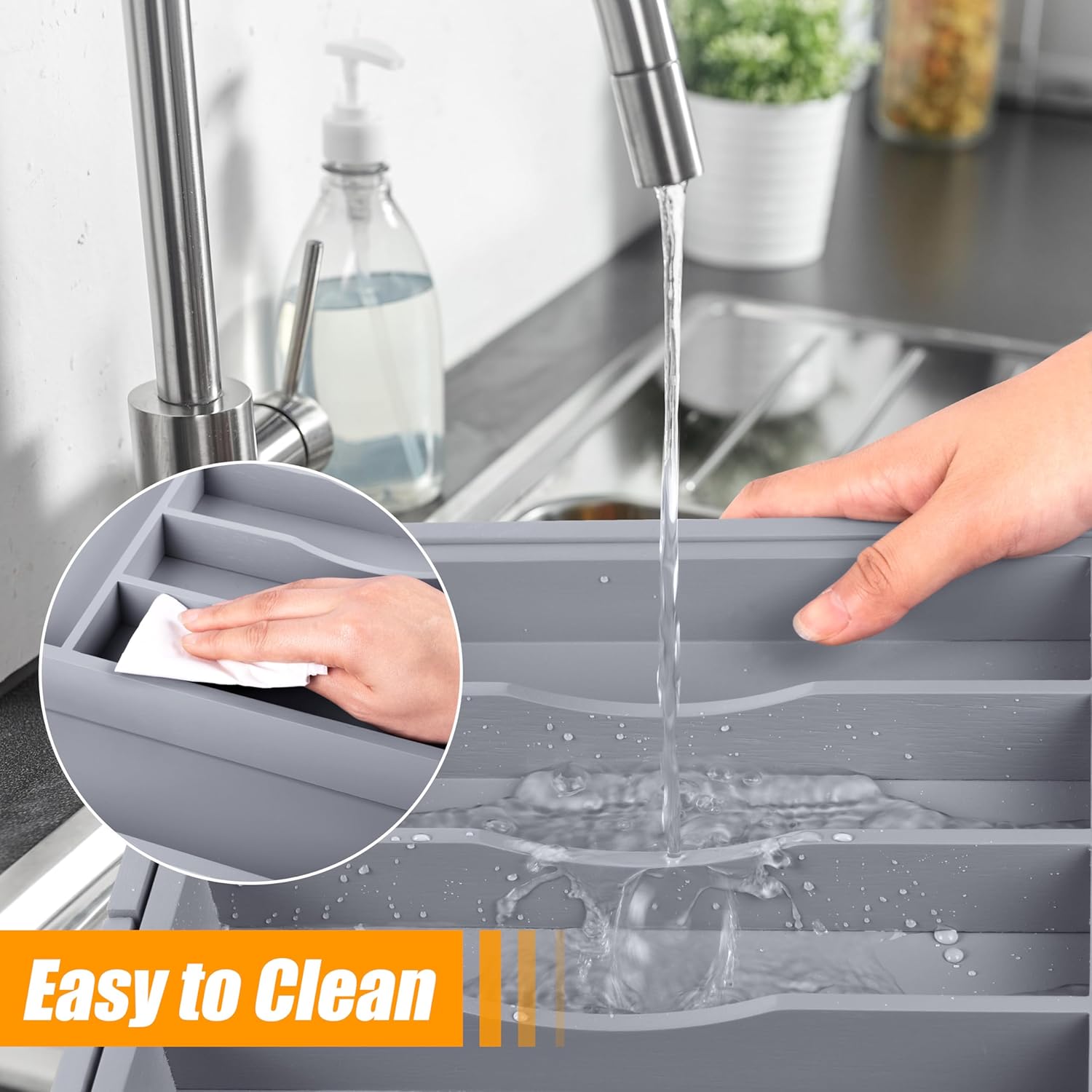 - ✅【Quality - Deep Compartments & Reinforced Base】Our utensil drawer organizer features compartments with a depth of 1.9 inches, helping maximize drawer space and perfect for storing more essential tools and gadgets. The utensil silverware drawer organizer comes with a reinforced base, ensuring durability for long-term use, and is ideal for supporting the weight of heavy-duty utensils and knives. Keep everything you need conveniently at hand while cooking, neatly visible, and easy to grasp when preparing the next meal in the kitchen.