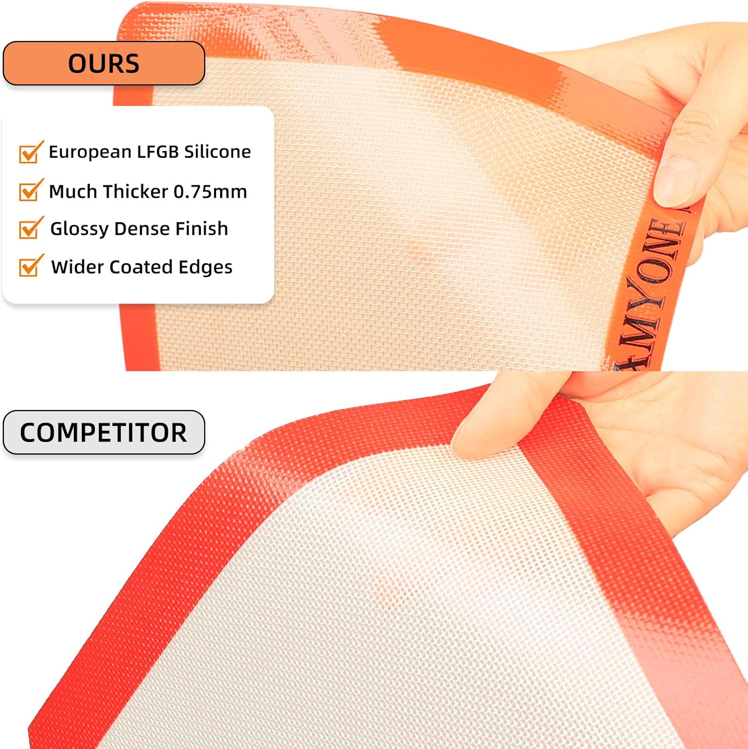 - đ§ăTOP-QUALITY ROBUST CONSTRUCTIONăCrafted from premium food-grade silicone and internally reinforced with fiberglass, this full silicone baking mat is built to last. It meets European standard, guaranteeing reliable performance for all your baking needs. With a thickness of 0.75mm and with glossy dense finish as well as wider coated edges, these baking mats for full size sheets, can withstand temperatures ranging from -40°F to 480°F making it suitable for a wide range of baking needs.