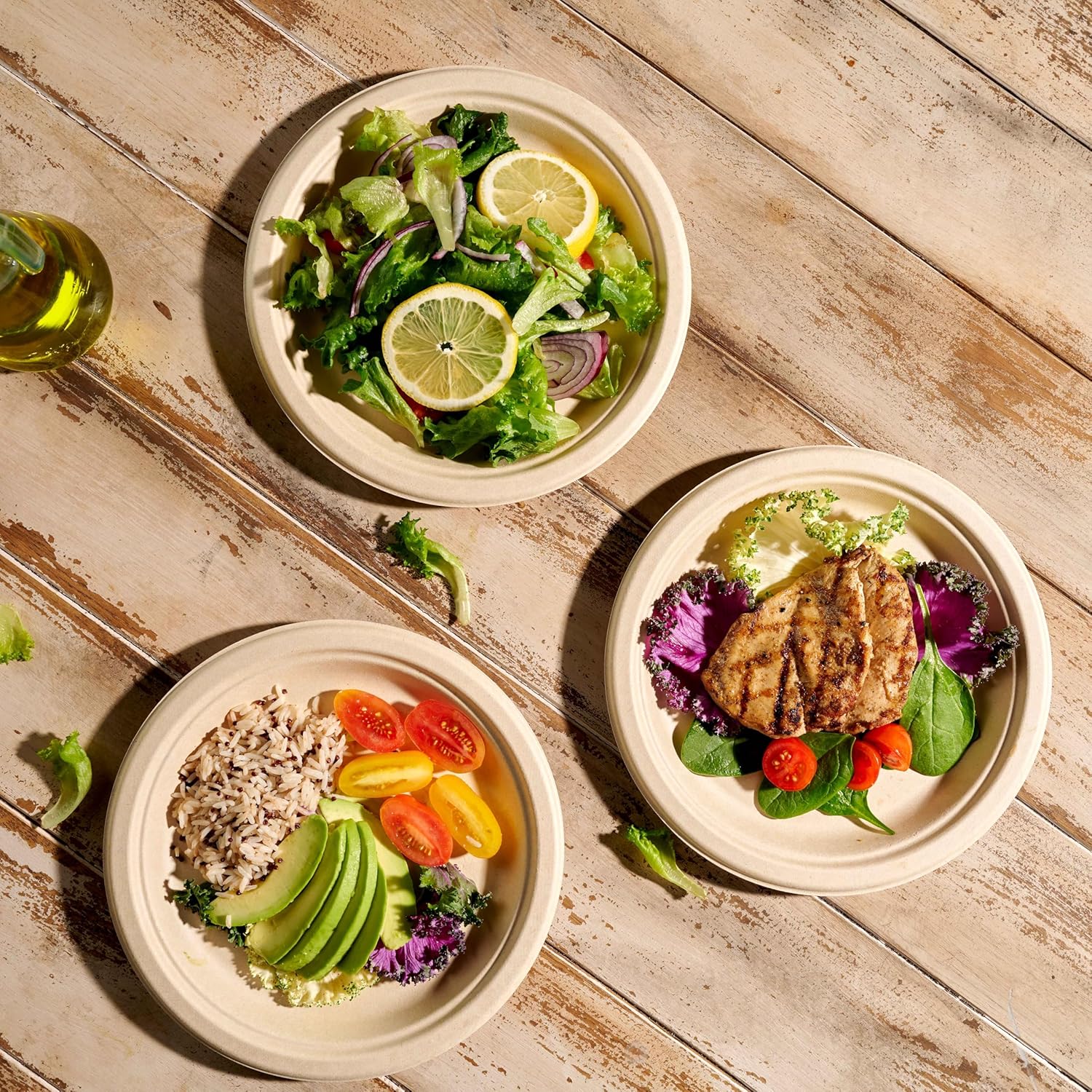 - 100% plant-based recycled bagasse and bamboo, no trees were used to create the paper dinner plates! Just sugar cane leftovers turned into paper-like biodegradable plates. Sturdy and strong thick paper plates able to resist oil, sogginess, bending, and knife cuts.
