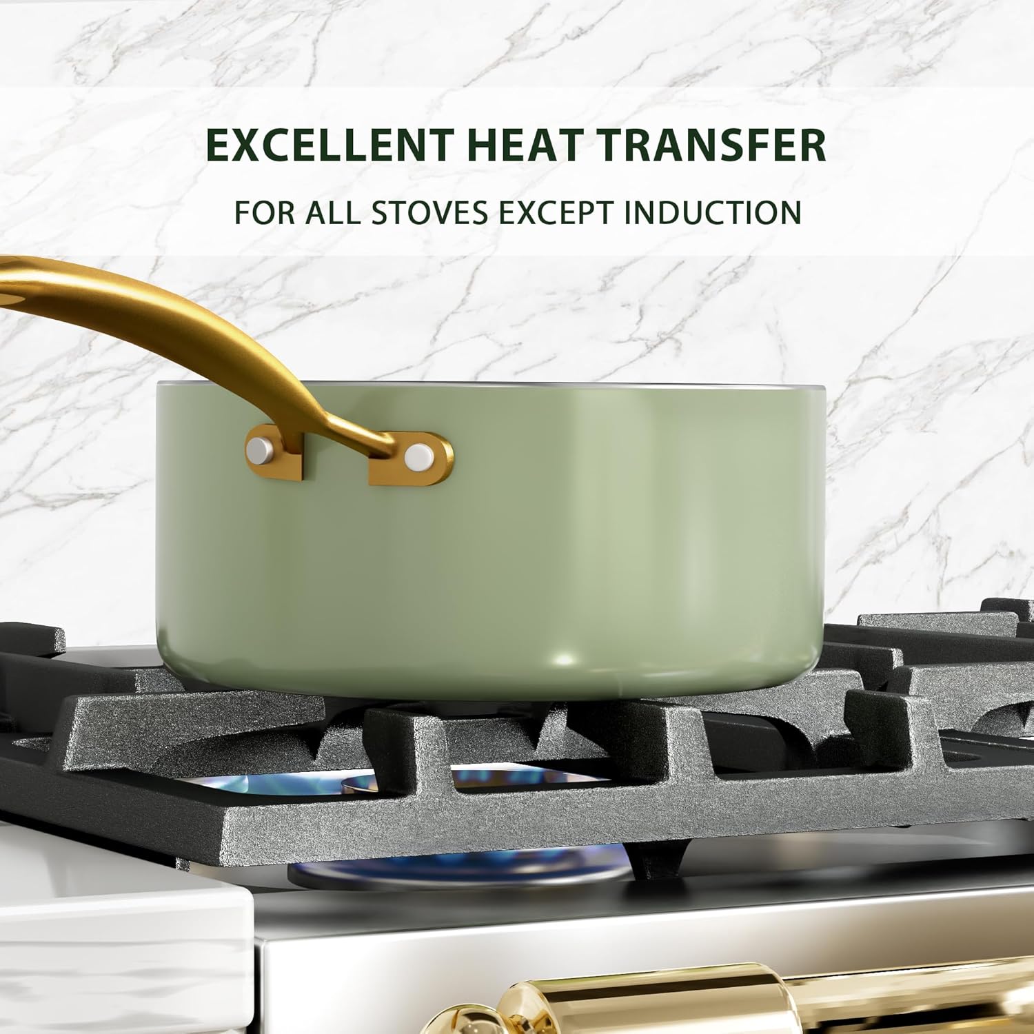 - Naturally Nonstick: No more sticky or difficult-to-clean problems. The Ceramic Cookware Set require less oil or butter for cooking and minimal scrubbing for a spotlessly clean, giving you a healthy and easy at-home culinary experience.