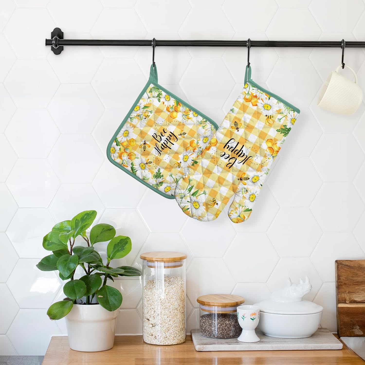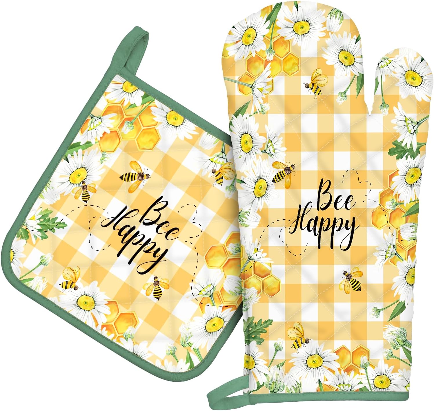 Bee Daisy Oven Mitts and Pot Holders Sets 100% Cotton Heat Resistant, Extra Long Oven Gloves Potholder for Kitchen Cooking Baking Housewarming