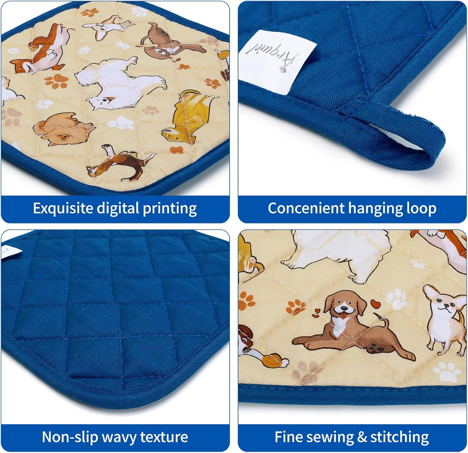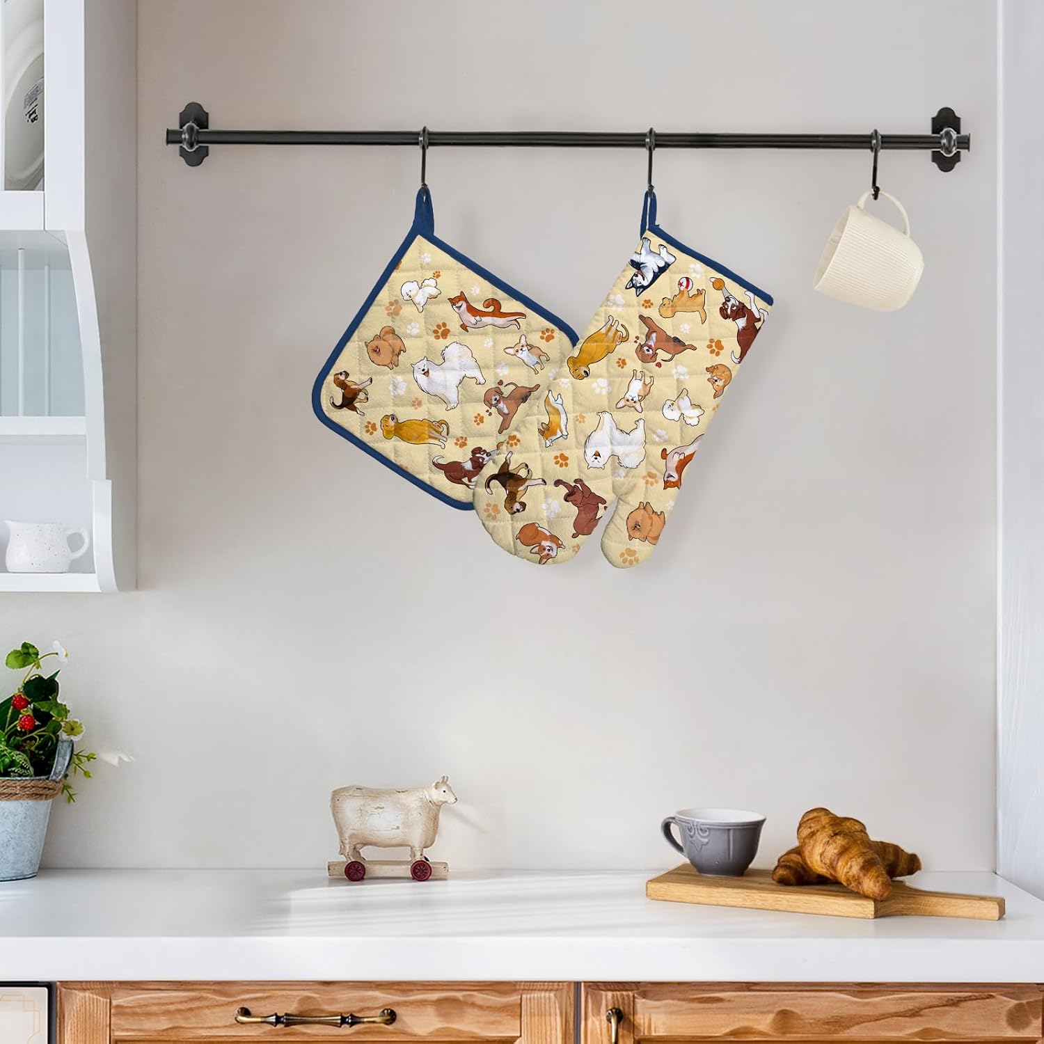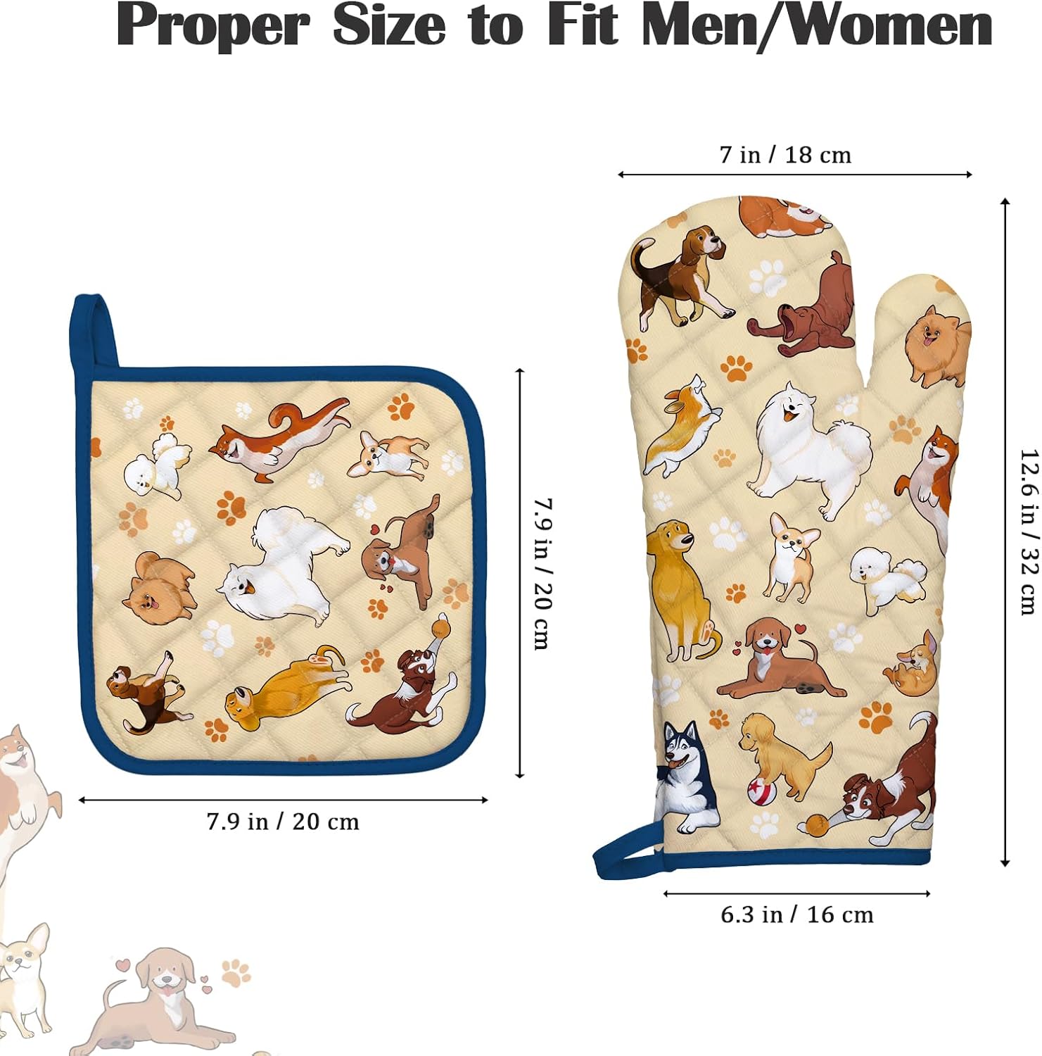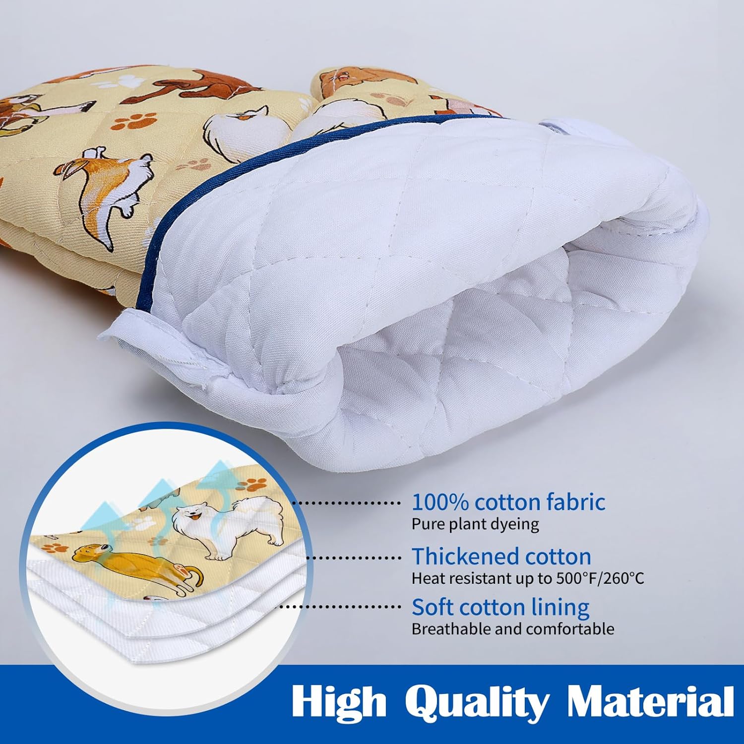 Dogs Oven Mitts and Pot Holders Sets 100% Cotton Heat Resistant, Extra Long Oven Gloves Potholder for Kitchen Cooking Baking Housewarming