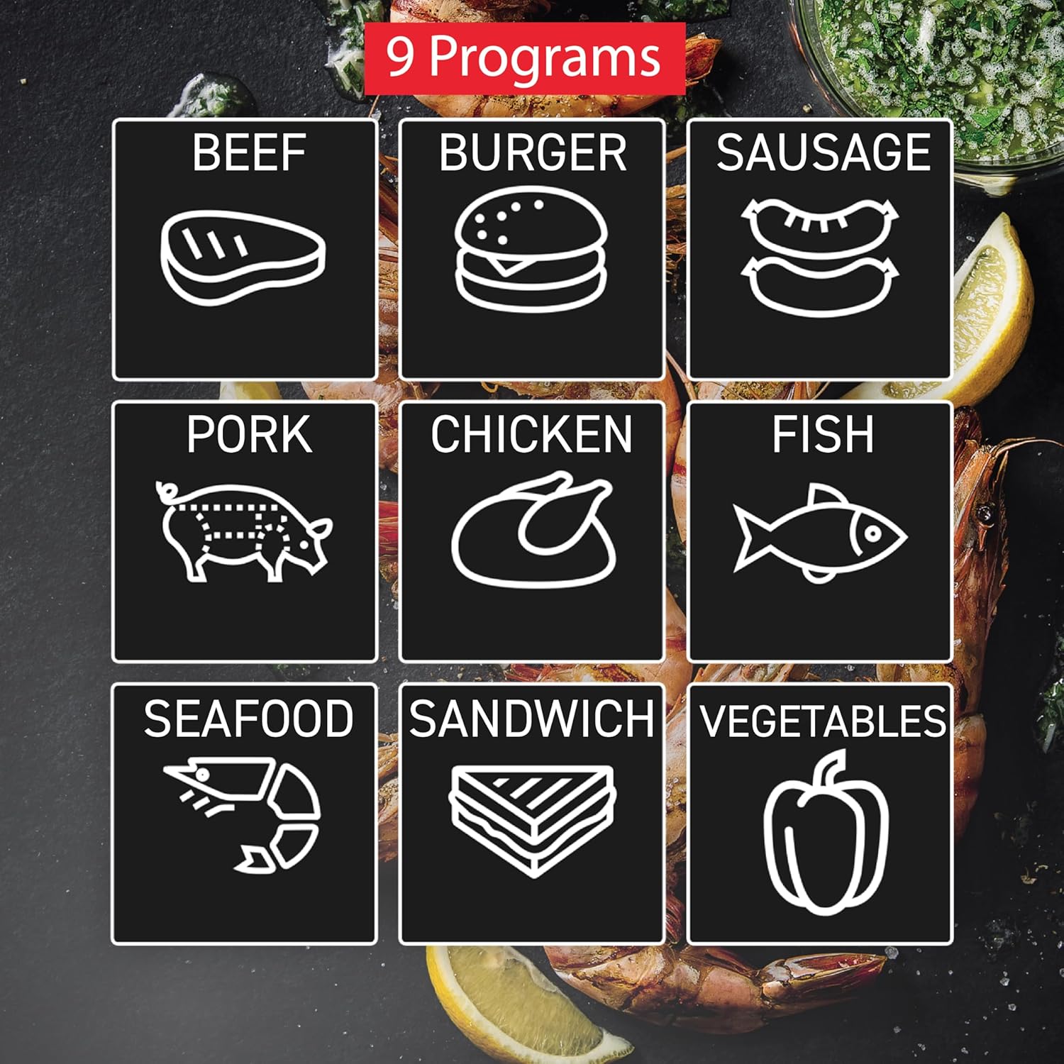 - 9 SMART COOKING PROGRAMS: Nine pre-programmed settings for hamburger, poultry, fish, sandwiches, pork, sausage and even more!