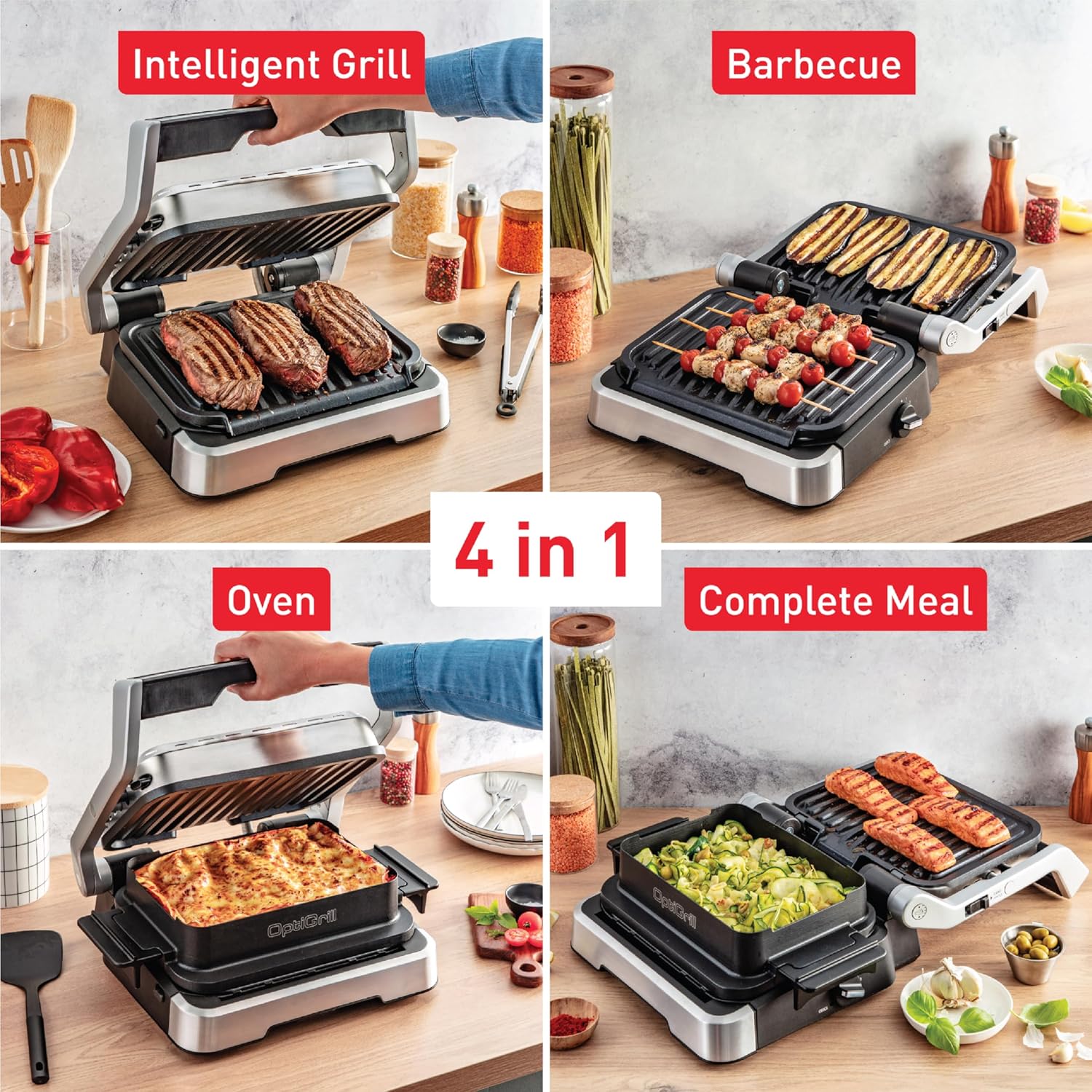 T-fal, Electric Grill, OptiGrill 4in1, Stainless Steel, 9 Automatic Cooking Modes, Intelligent Grilling Rare to Well-Done, 1800 Watts, Nonstick Removable Plates, Dishwasher Safe, Indoor, Silver