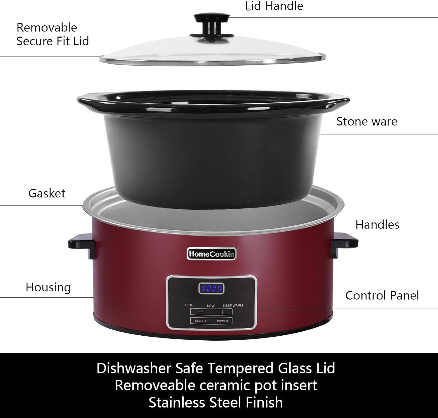 HOMECOOKIN 6 Quart Programmable Slow Cooker, Kitchen Appliances, Perfect Kitchen Small Appliance for Family Dinners, Red Stainless Steel