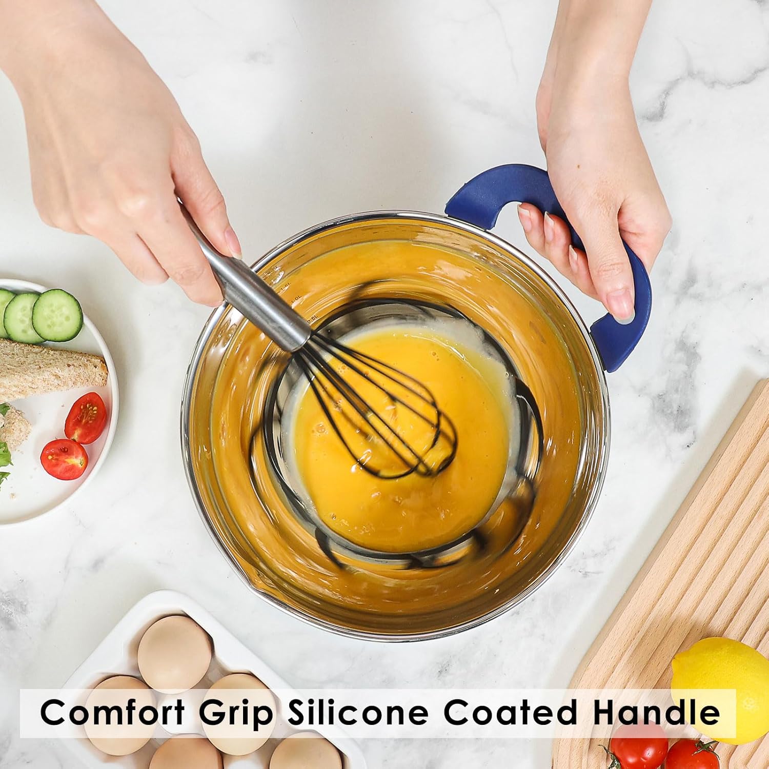- 【Unique Design, Combine Practicality with Elegance】 The silicone handles make the bowls easier to hold down on a surface when mixing. The non-slip silicone bottom ensures the bowls will stay in place when you mixing. Inner measurements with quart and liter markings for easy measuring. The spout allows for easier pouring. The fitting lids for all bowls keep your food fresh and prevent messes