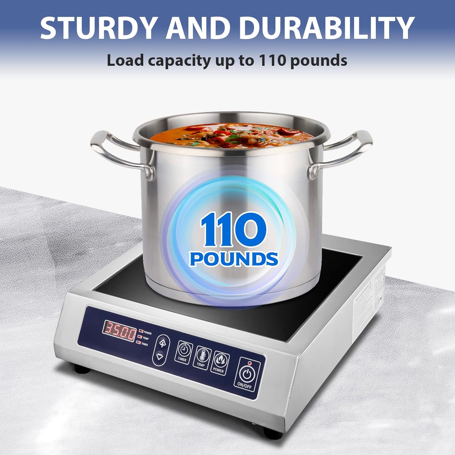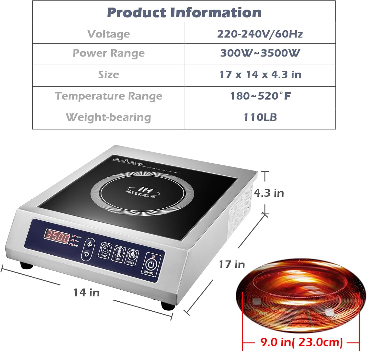 - 【HIGH EFFICIENCY】This commercial induction cooker has easy-touch controls with 10 power levels from 300 to 3500 watts and a temperature settings from 180°F to 520°F for accurate, even heating. Operates with 93% energy efficiency,and it's more efficient than traditional electric hot plate and gas stove.