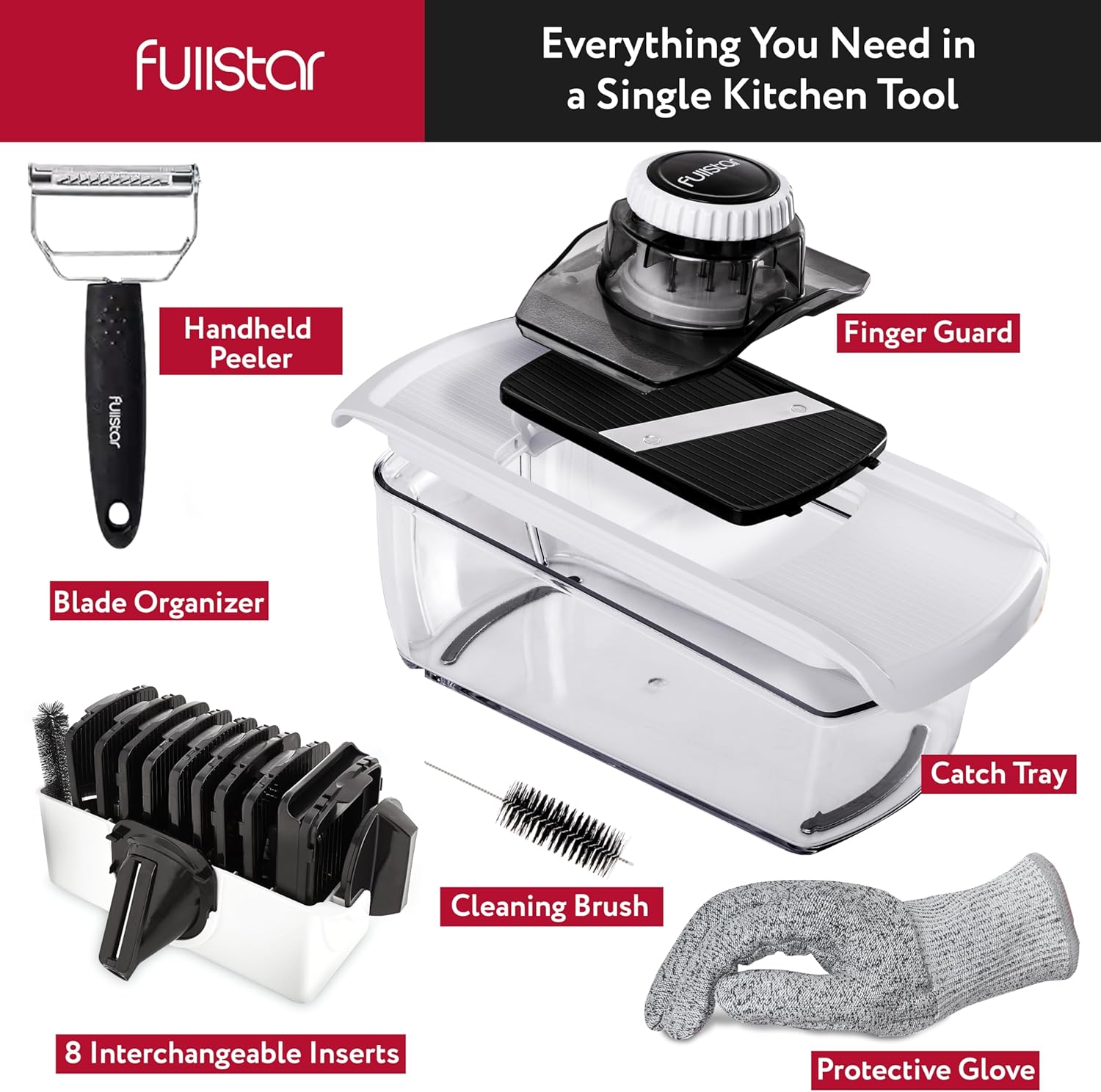 Fullstar Mandoline Slicer for Kitchen, Fruit Cutter, Cheese Grater, Cucumber Slicer, Veggie Spiralizer, Food Cutter & Kitchen Gadgets with Safety Glove (9 in 1, White)