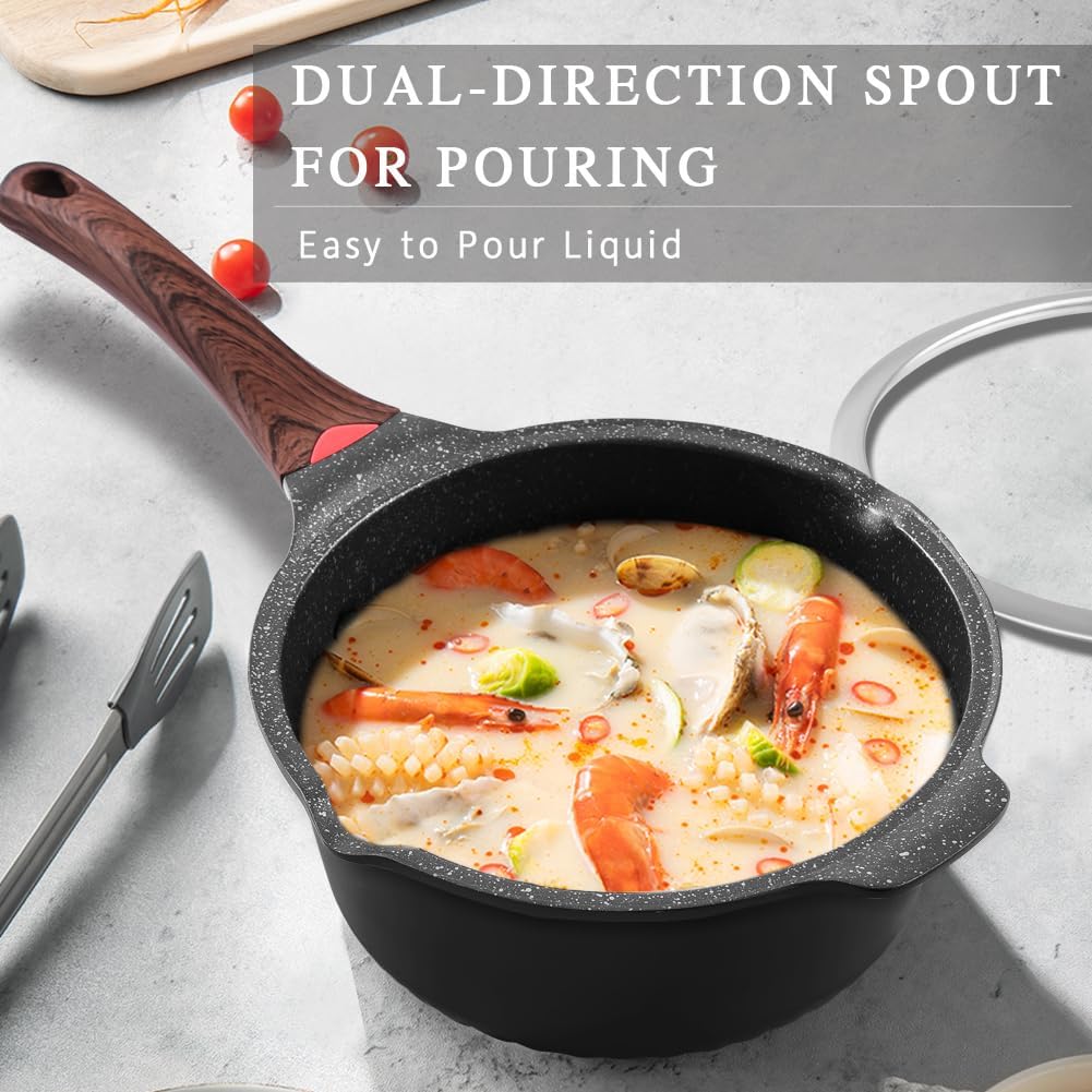- 【4QT Non-Stick Milk Pot】Features PFOA/PFOS-free granite coating designed to require less oil with reduced smoke production. Includes lid and easy-release coating, suitable for heating milk, making porridge or preparing sauces.
