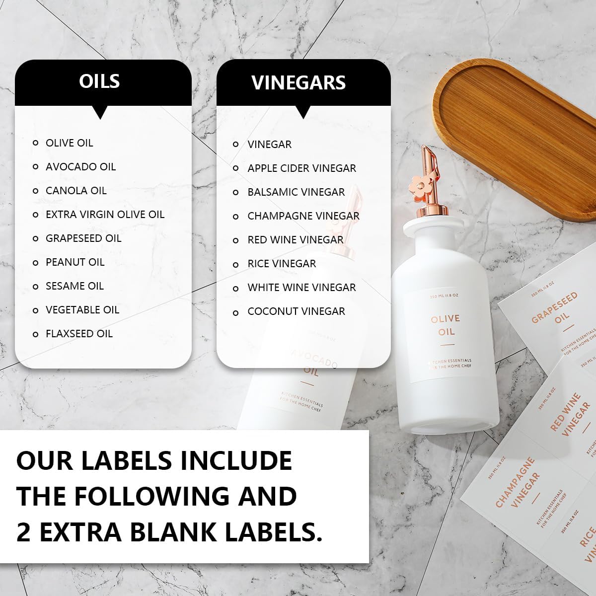 - KITCHEN OLIVE OIL DISPENSER BOTTLES – The oil and vinegar dispenser set contains 2 white 11.8oz (350ML) glass bottles, 2 rose gold stainless steel oil spouts, 17 waterproof labels(kinds of oil and vinegar) and a bamboo tray, Ideal for safely store and dispense your olive oil and vinegar.