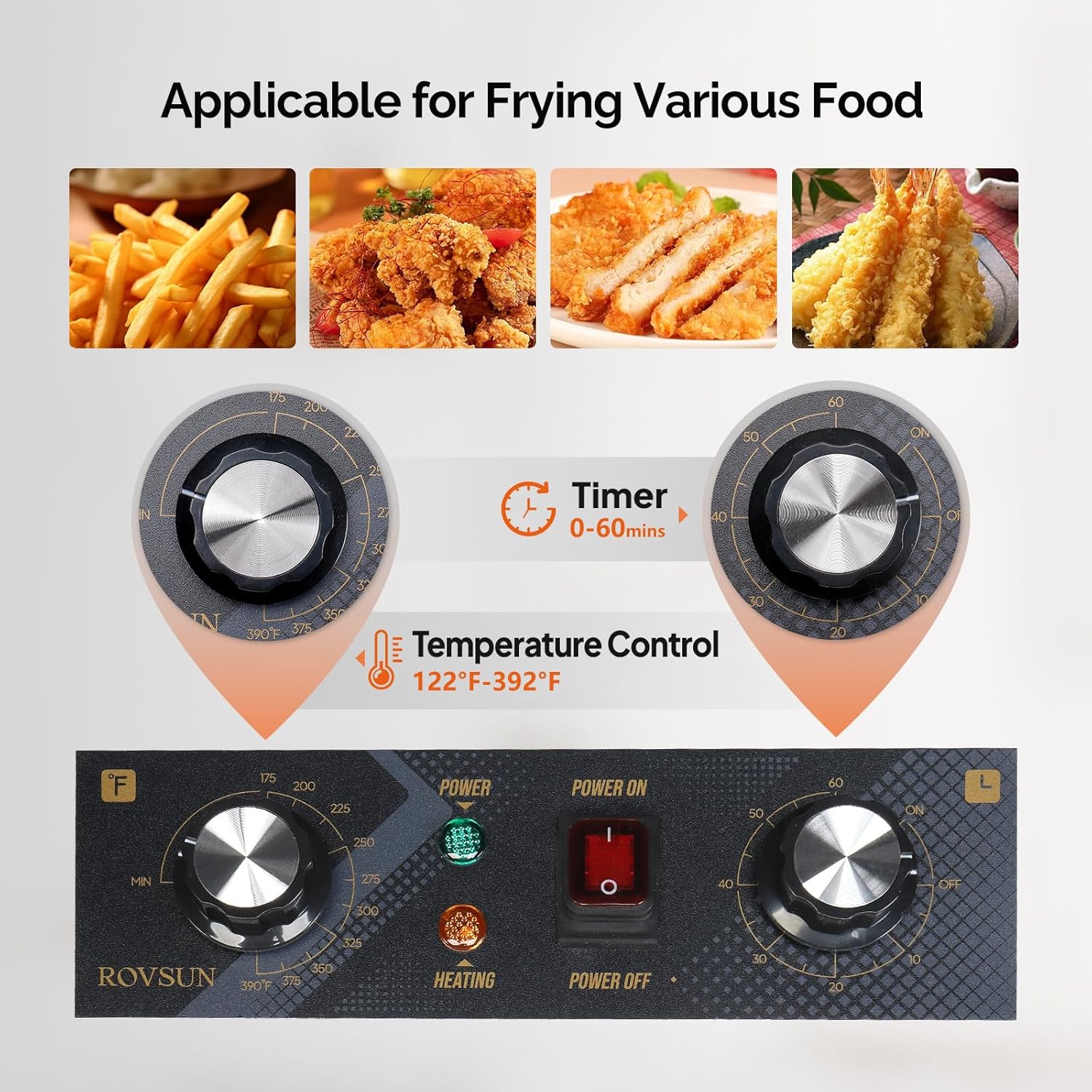 - 【Wide Usage】The deep fryer is perfect for commercial use, such as restaurants, supermarkets, fast food stands, snack bars, parties, etc. Suitable for french fries, onion rings, buffalo wings, chicken, dumplings, egg rolls, shrimp rolls, mozzarella sticks, jalapeno poppers, etc. (NOTE: Two working modes: 1.Continuous working mode: adjust the timing knob to “ON” and then select the temperature. 2.Timing working mode: adjust the timing knob to set time and then select the temperature.)