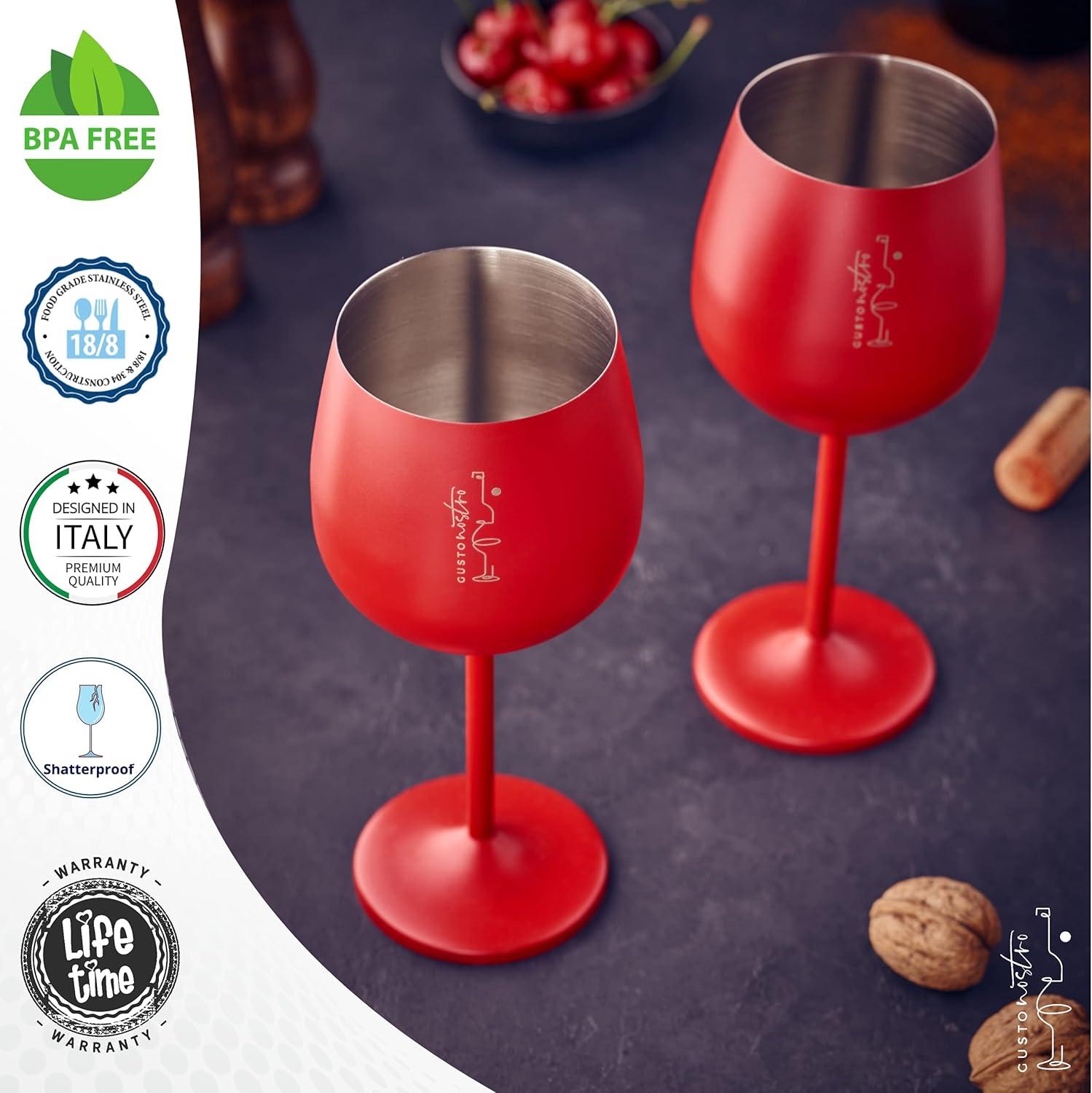 - TASTEFULLY PACKAGED and ready to bestow on friends, family and colleagues, Gusto Nostro Stainless Steel Stemmed Wine Glasses make impressive housewarming, wedding or Christmas gifts for wine lovers.
