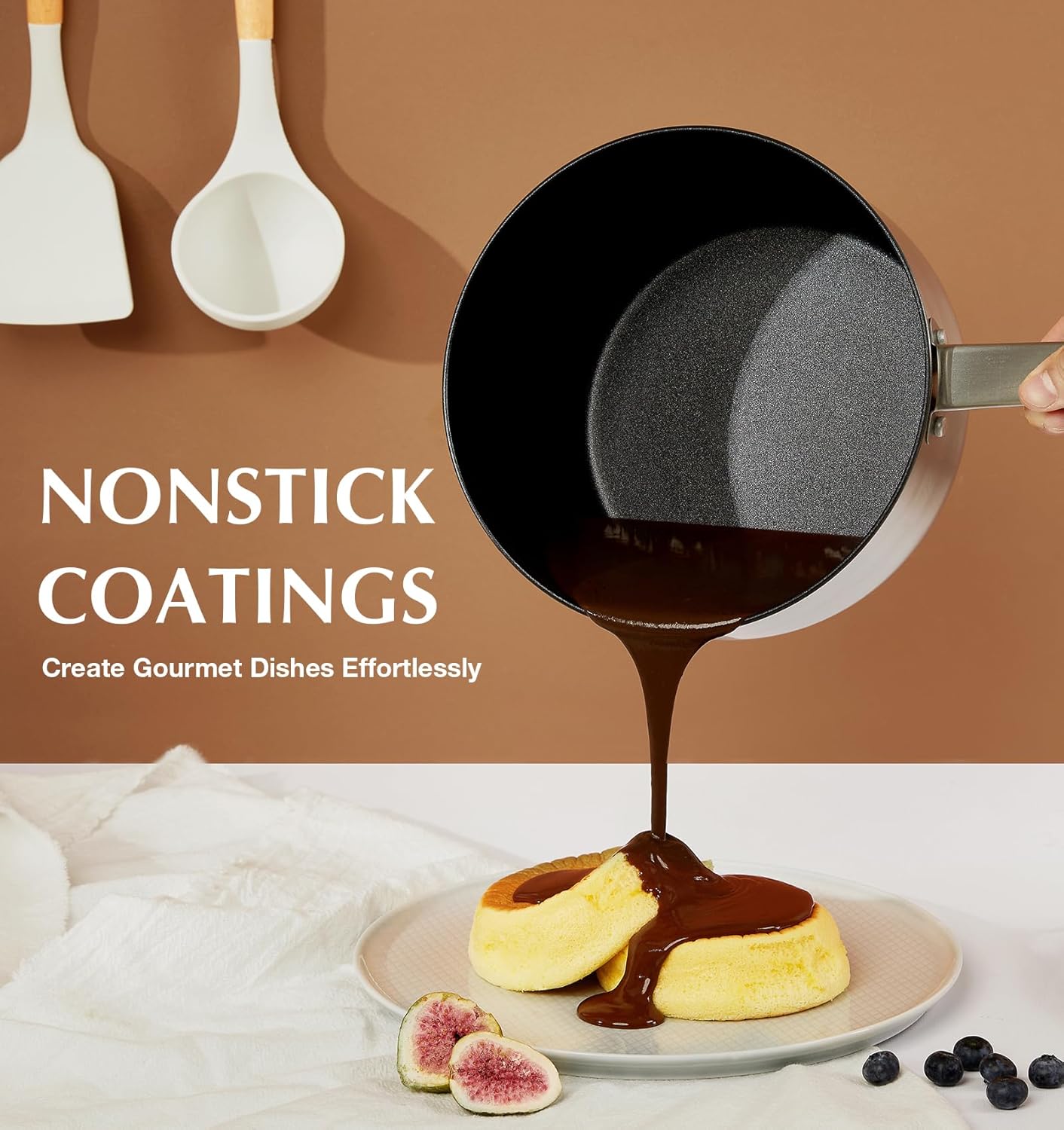 - Versatile Set of Two Saucepans in Different Sizes: This set features a 1-quart saucepan and a 2-quart saucepan, essential for a variety of cooking tasks. Whether you're heating milk for coffee or simmering sauces for dinner, these stylish and practical kitchen essentials meet your everyday cooking needs with ease