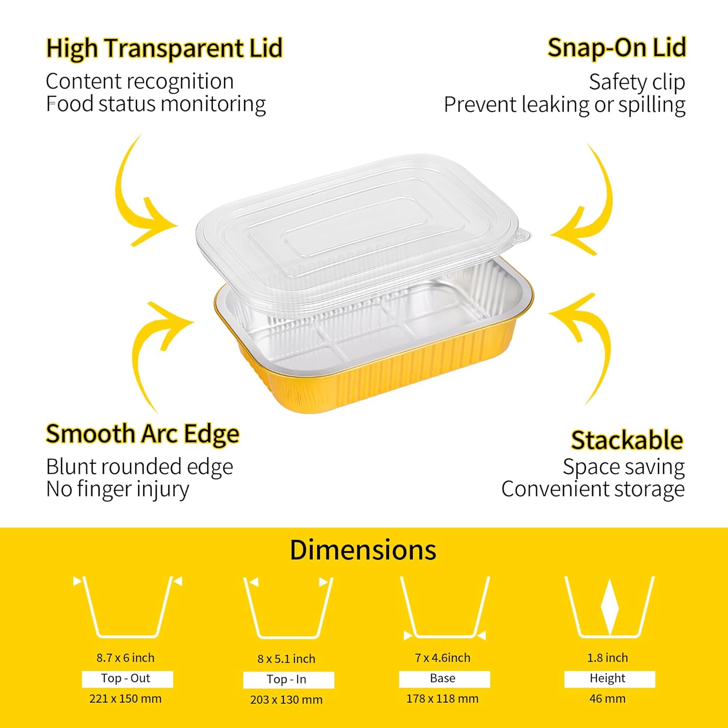 - 【40 Pack Foil Pans with Lids】You will get 40pcs aluminum foil pans and 40pcs PP lids (Size: 8.7"×6"×1.8"). The 2.25 lb deep portable container is perfect for your lunch. These aluminum foil baking pans with lids are great for baking and making bread. These takeout tin pans have smooth edges so no need to worry about stabbing your hands, and the PP lids seal tightly to prevent leaks and spills from the sides.