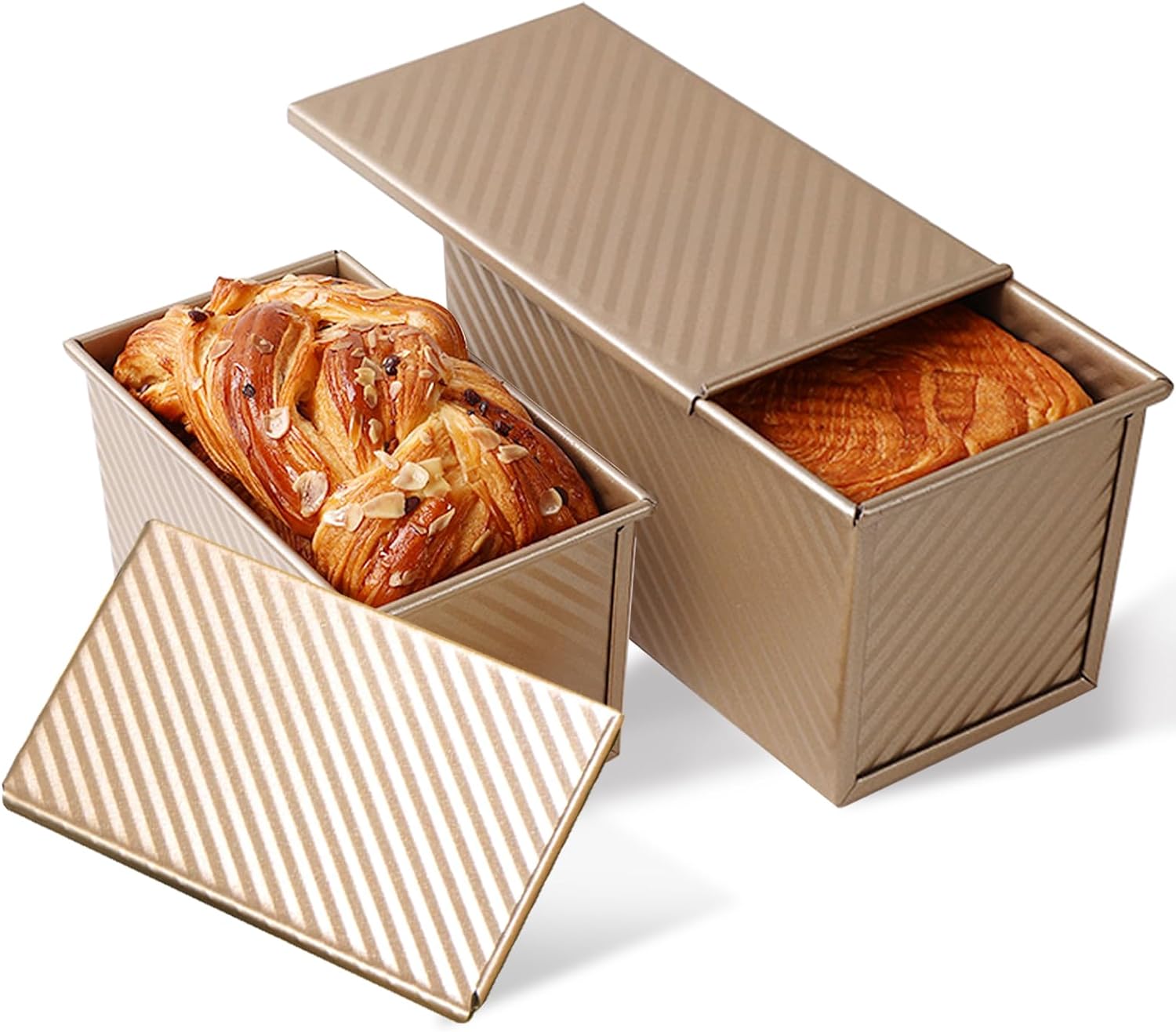 2 Pack Pullman Loaf Pan with Lid, 1 lb/0.5 lb Dough Capacity, Carbon Steel Corrugated, Non-Stick Sandwich Bread Loaf Pan with Lid