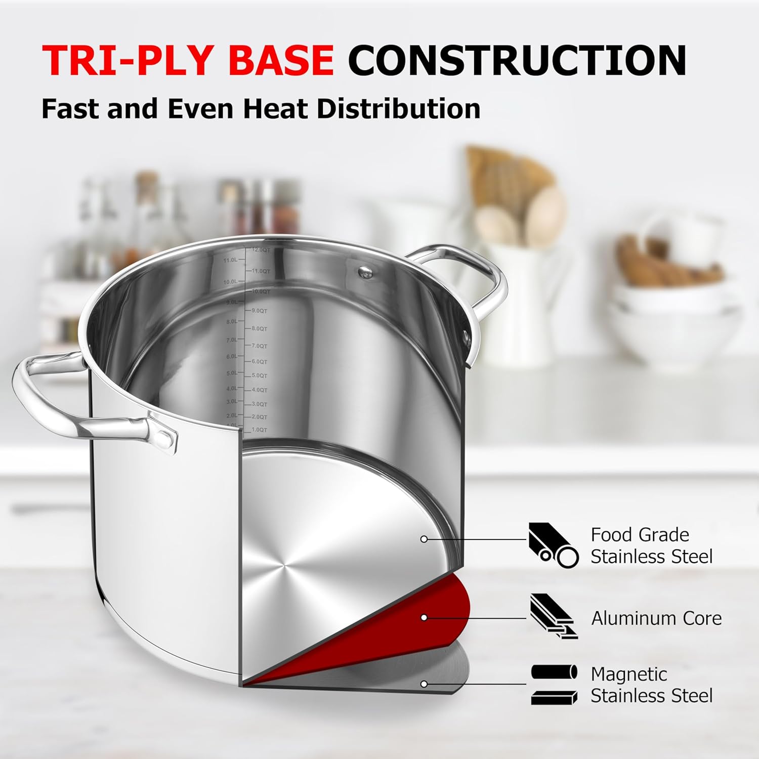 LIANYU 12 QT Stock Pot with Lid, 12 Quart Stainless Steel Large Tall Soup Pot for Cooking, Big Deep Stockpot with Visible Lid, Tri-ply Heavy Duty Stockpot for Induction, Stoves, Gas