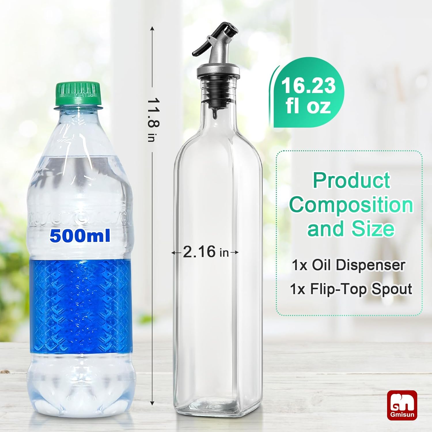 - VALUABLE OIL DISPENSER FOR KITCHEN: GMISUN is devoted to oil dispenser for kitchen for years, and it can provide high-end and considerable oil bottle. This oil bottles for kitchen comes with 1 cooking oil dispenser, 1 plastic flip spouts. It can meet your daily sauces needs such as olive oil, cooking oil, vinegar, cooking wine, soy sauce, etc.