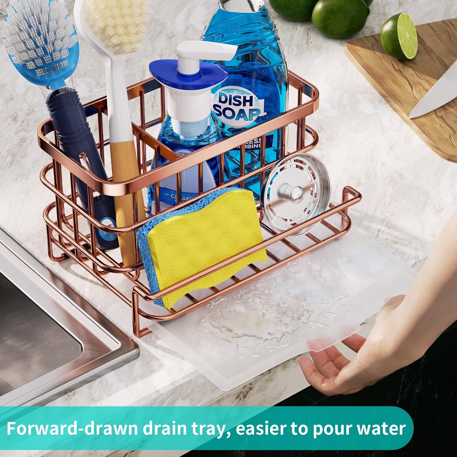 HapiRm Multifunctional Kitchen Sink Organizer, Large Sink Caddy with Drain Tray, SUS304 Stainless Steel Rustproof Sponge Holder for Kitchen Countertop - Rose Gold