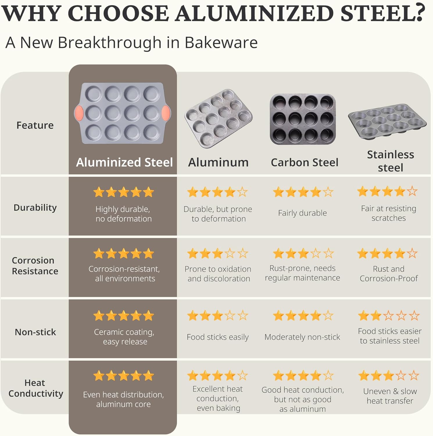 - Heavy-Duty Aluminized Steel: Muffin pan and cupcake pans are made from highly durable aluminized steel, offering 50% better corrosion resistance and durability compared to traditional muffin pans. The even heat distribution significantly shortens baking time and can withstand temperatures up to 500°F. Suitable for use in ovens, dishwashers, refrigerators, and freezers, greatly enhancing convenience.