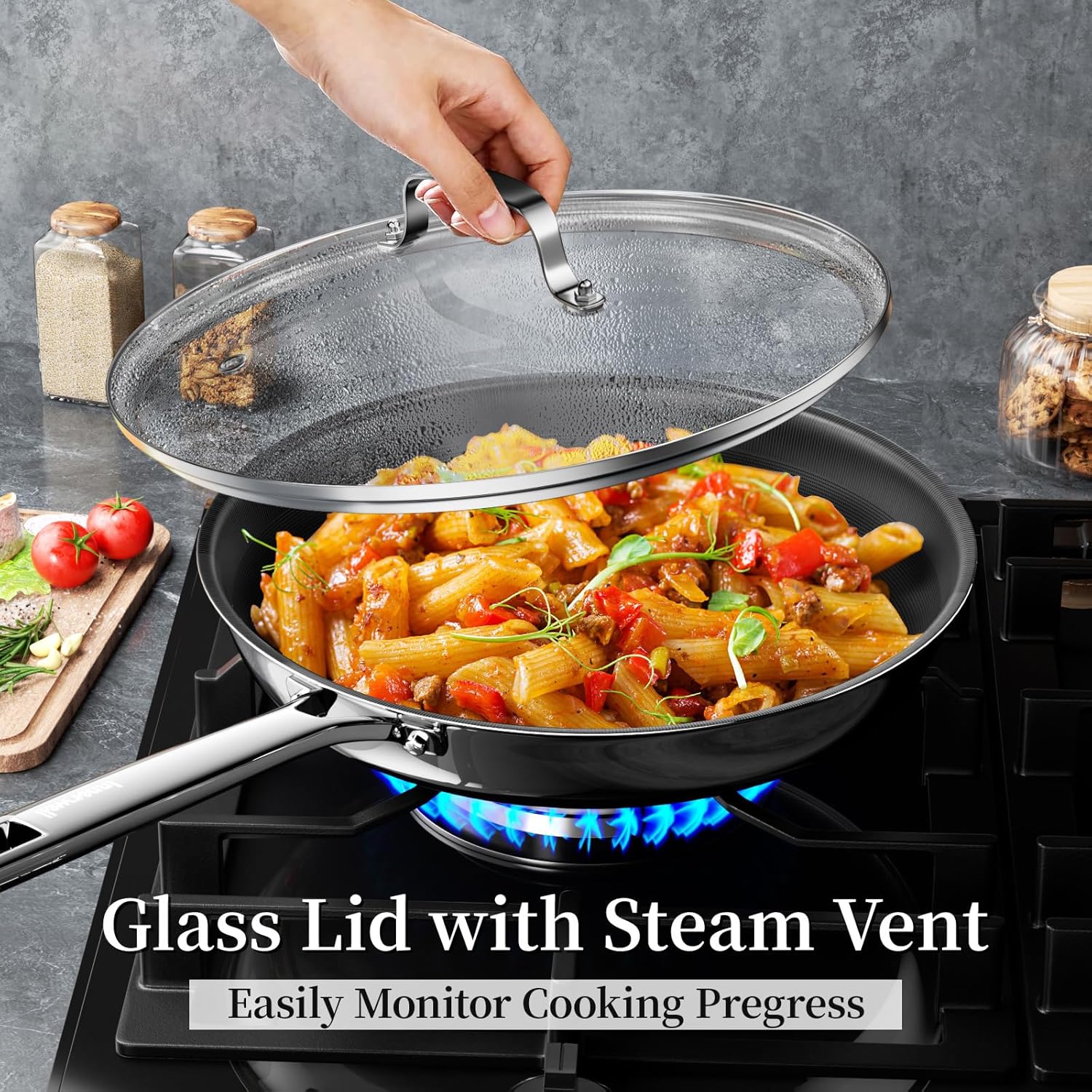 - 【TITANIUM CERAMIC NON-STICK COATING】Stainless steel frying pan with lid is made of advanced titanium ceramic non-stick coating technology, the internal coating is made of titanium metal and ceramic material, which has excellent non-stick,corrosion resistance and high temperature resistance. Food won't stick to the bottom of the pan while cooking and it's easy to clean after use, just rinse it off.