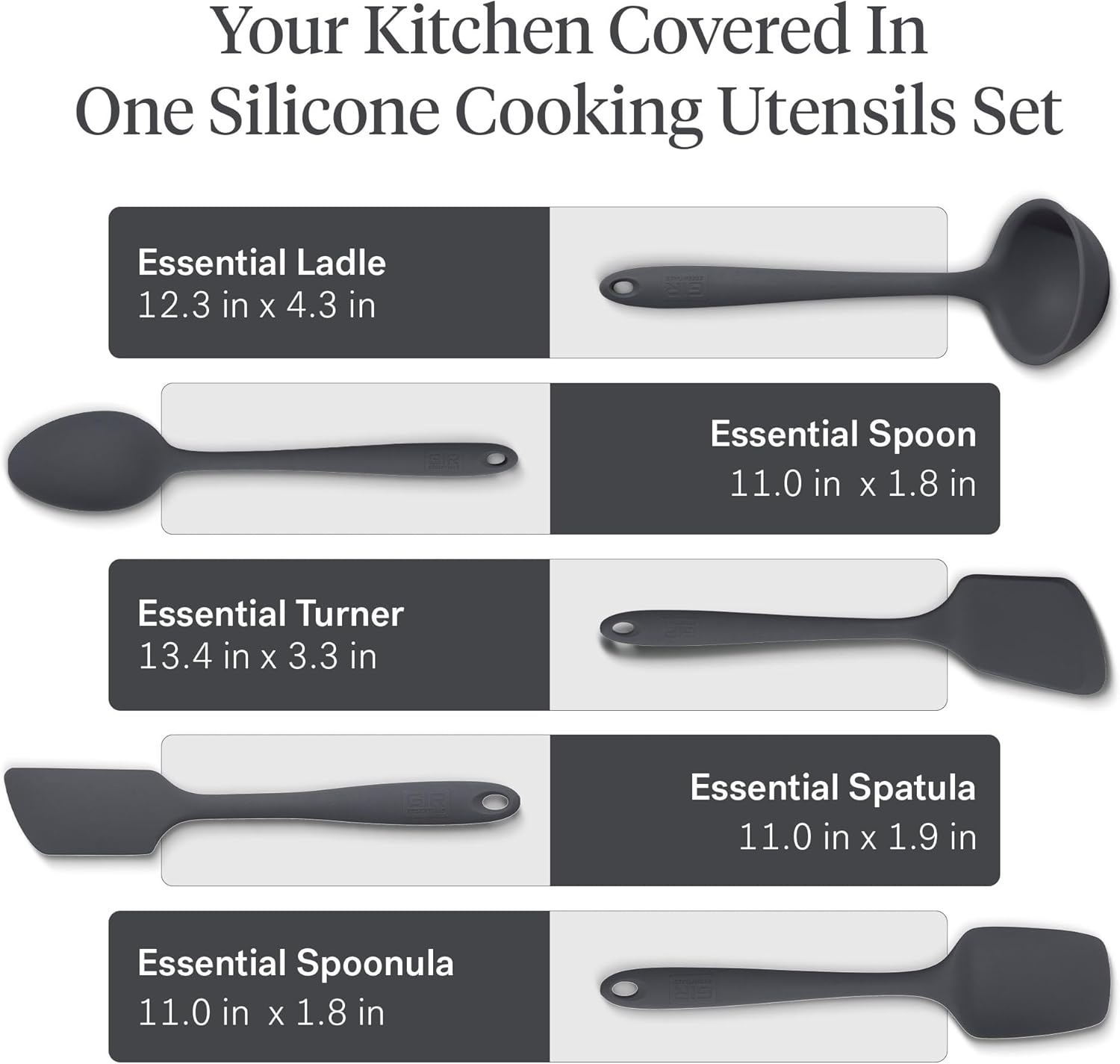 GIR: Get It Right 5 Piece Silicone Essentials Kitchen Utensils Set - Ladle, Spatula, Flip, Spoon & Spoonula - Non-Toxic Cooking Utensils for Nonstick Cookware, Cooking and Baking - Charcoal
