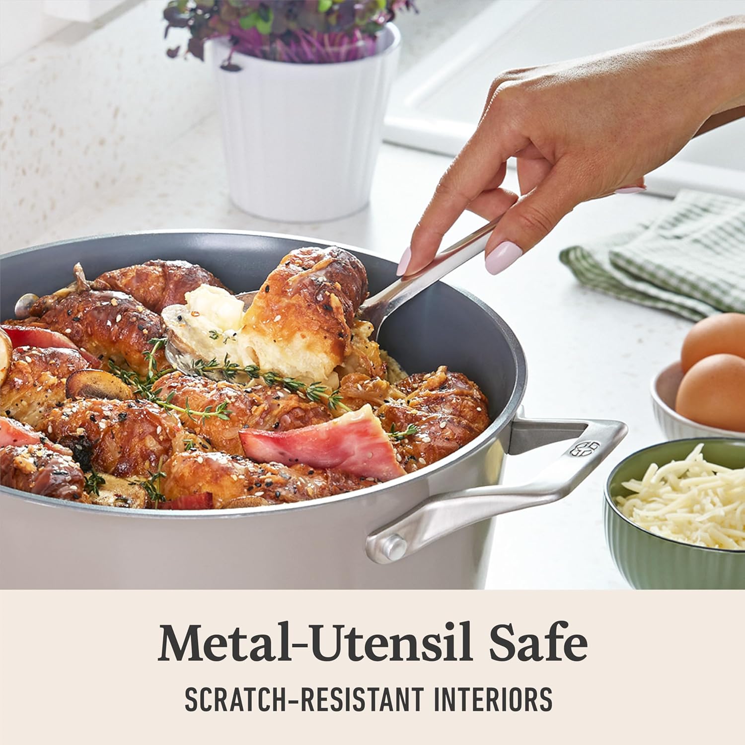 - Metal Utensil-Safe: Cooking from scratch deserves scratch-free cookware, so our ceramic pans have scratch-resistant interiors.