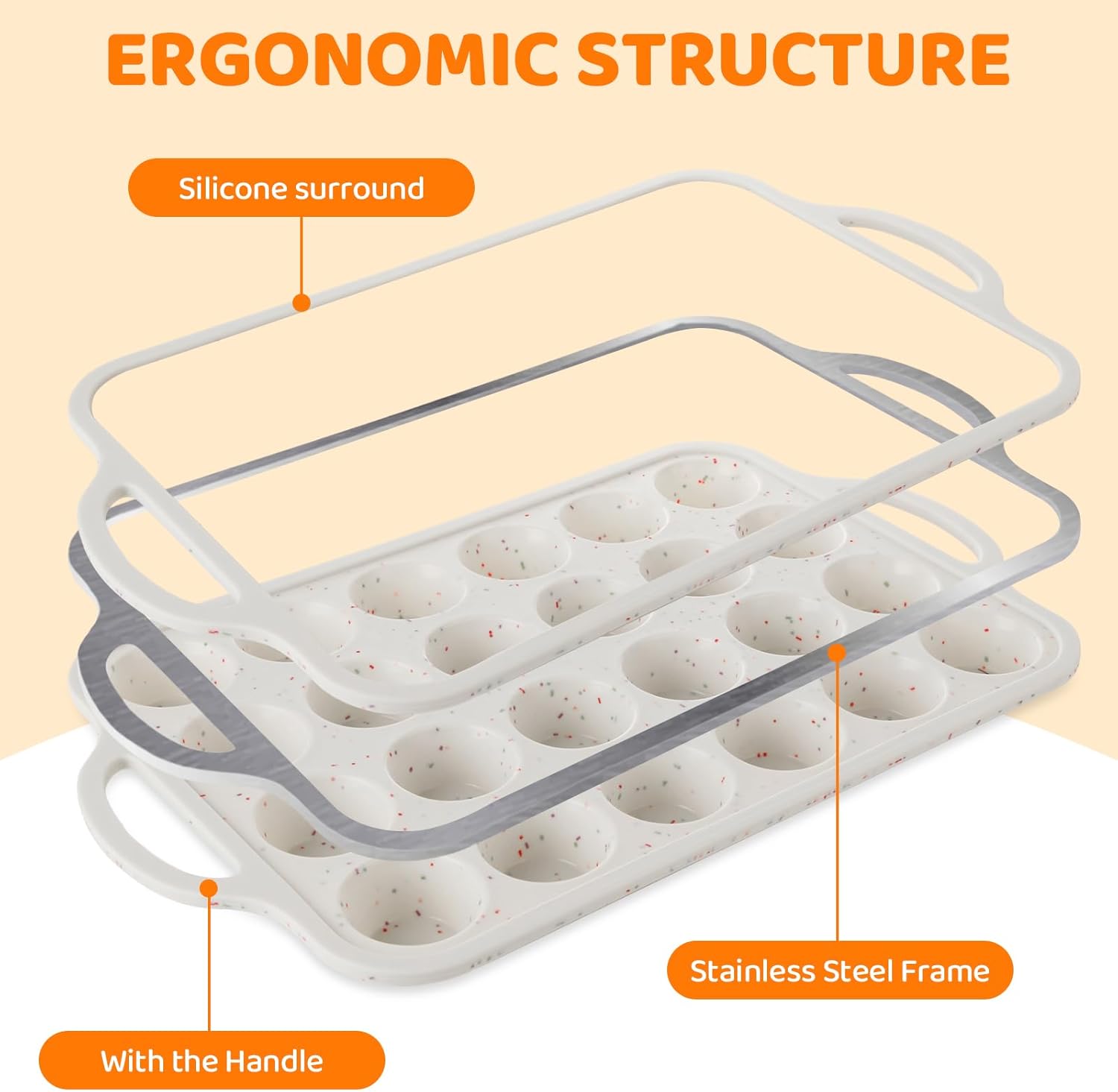 - METAL STRUCTURE: The hidden stainless steel frame around the outer edge makes silicone mini muffin pan more sturdy and resistant to deformation. No more spilling after batter fill in with when transfer baking pan from counter to oven