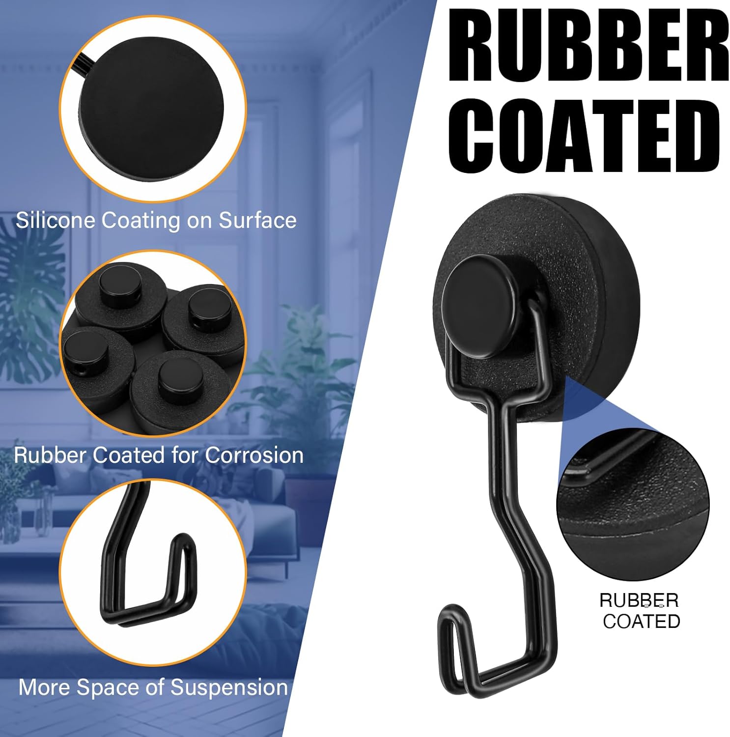 - Black magnetic hook with rubber base covers the whole magnet to prevent scratches and increase friction anti-slip. Rubber-coated protects the magnet from rusting for outdoor long-lasting use.