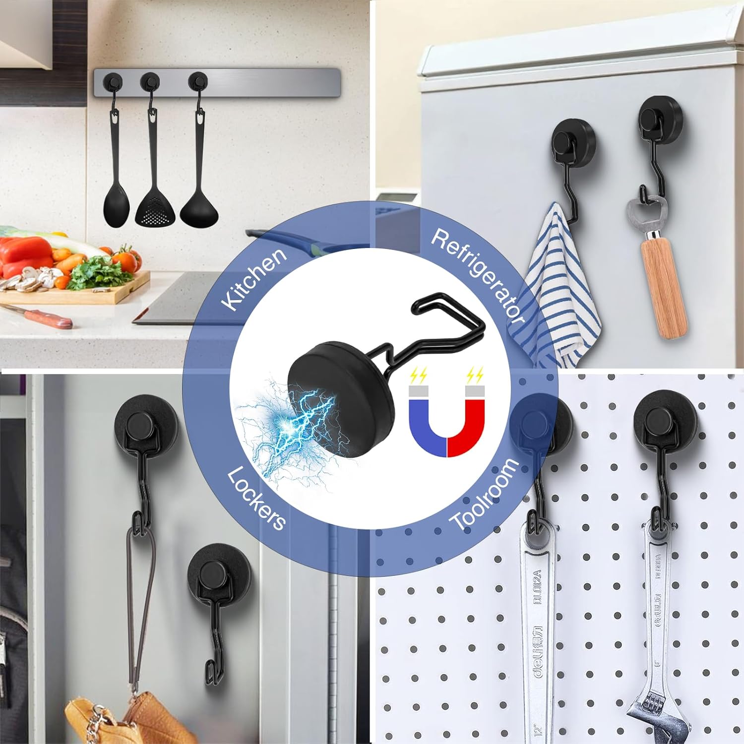 - The large size hook pitch can handle variety things and keeps items organized and nearby. Strong magnetic hooks perfect for Home, Classroom, Kitchen, Workplace, Office, Garage, Cabinet, Grill, Cruise, etc.