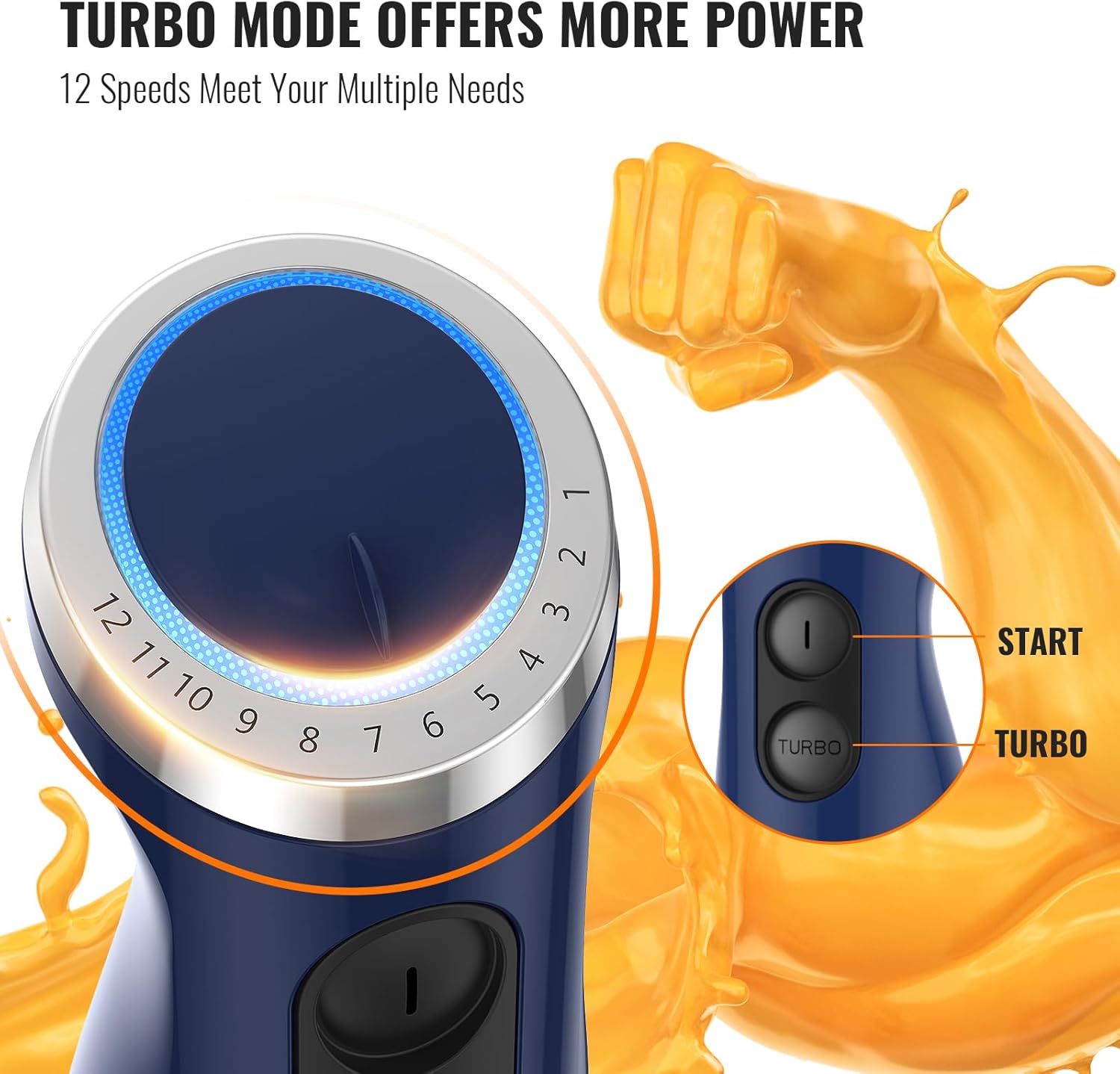 - 12 Speed & Turbo Boost – The immersion blender comes with 12 adjustable speed and Turbo boost,will meet your multiple needs to make smoothies,soups,whip cream,and much more.With the Turbo Button for maximum speed,you can chop meat and nuts easily in seconds.