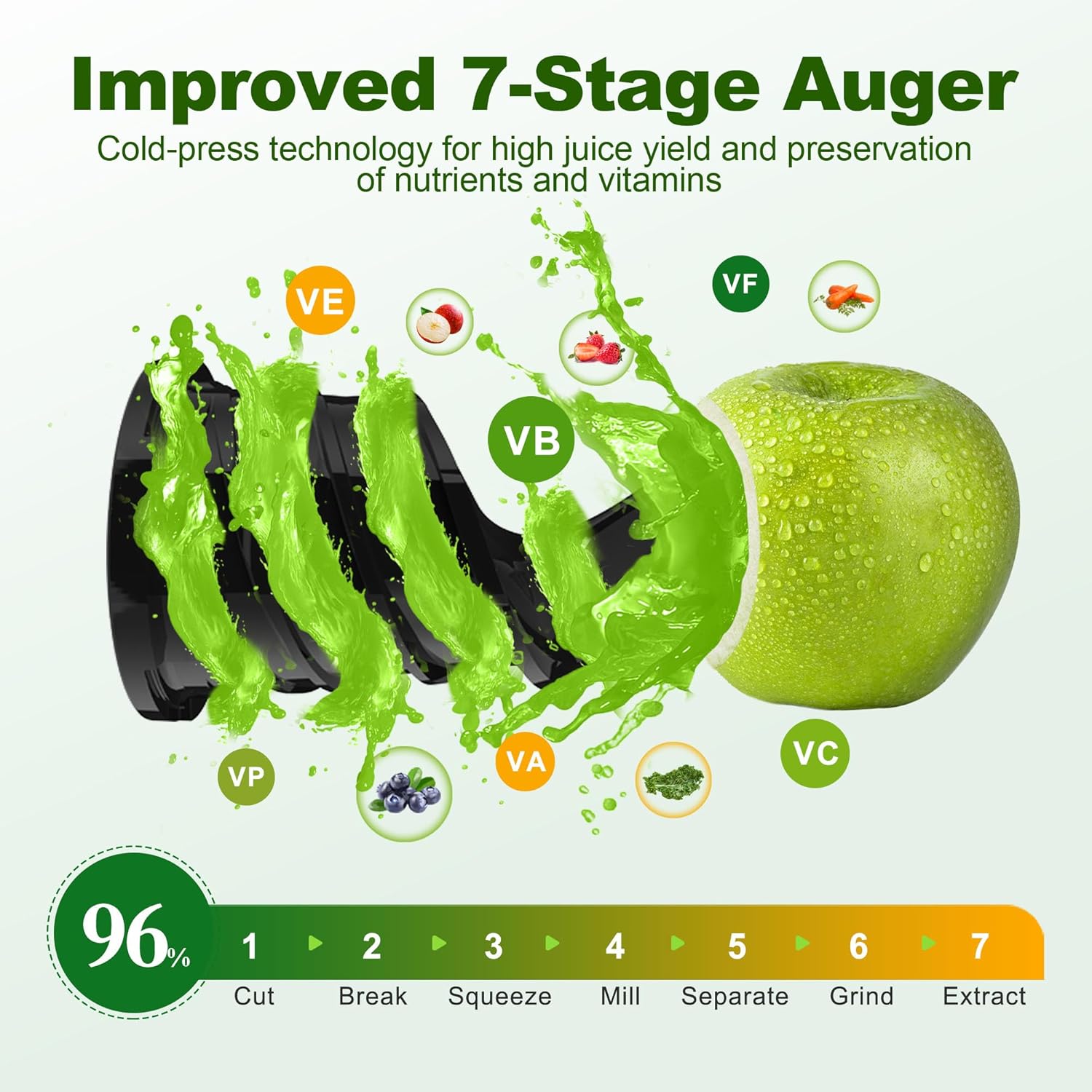 - Extra-Wide 5.3'' Chute & Large 1.8L Hopper: Skip the chopping, Fretta F6000’s extra-wide 5.3'' feed chute fits whole apples, carrots, and other hard produce, saving you prep time. While the 1.8L large self-feeding hopper lets you juice more in one go, perfect for families, healthy lifestyles, or entertaining—just load, press, and enjoy fresh juice faster!