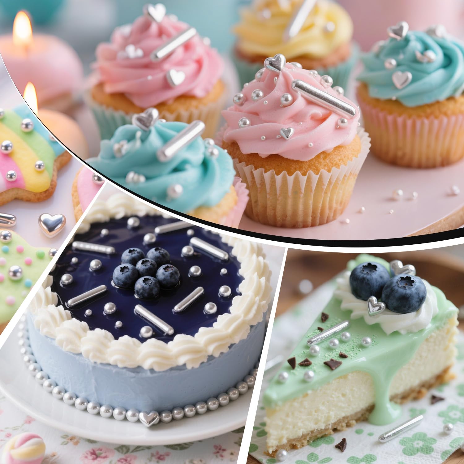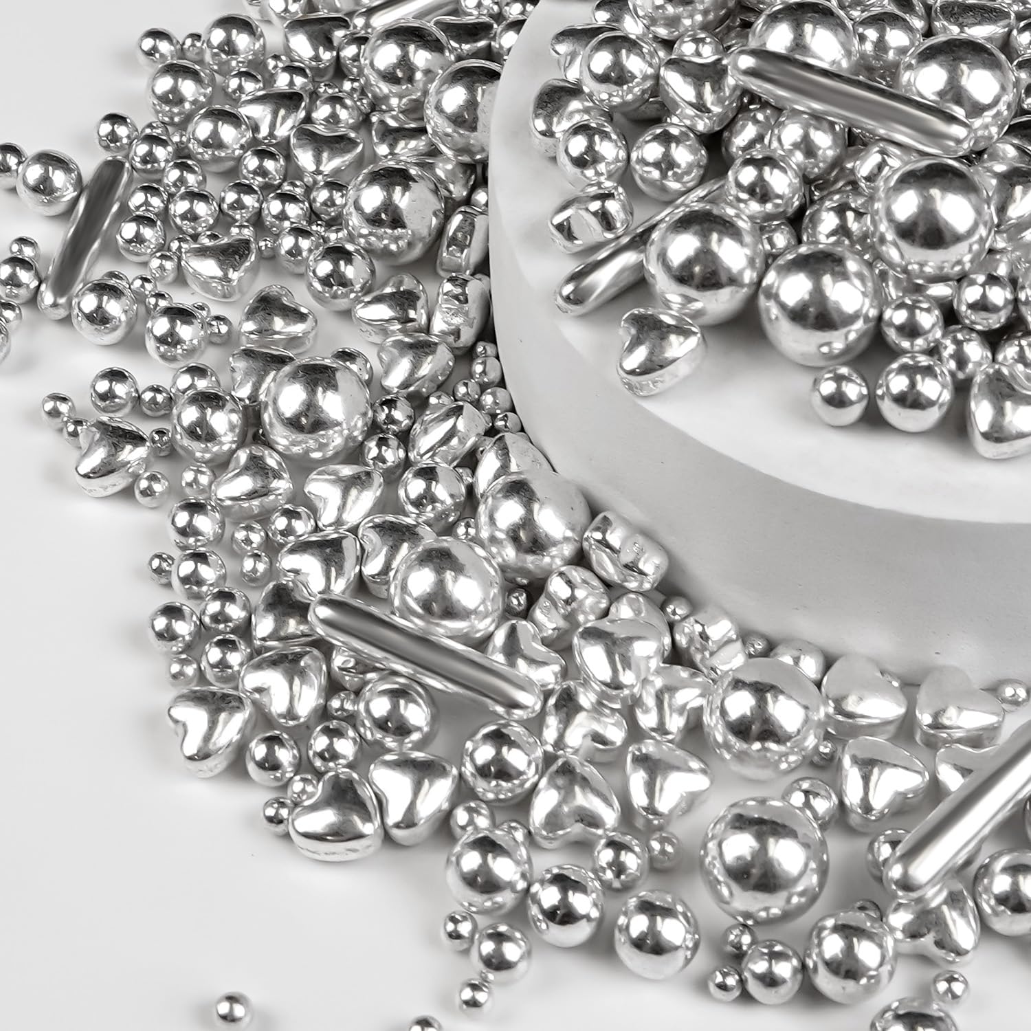 - Silver Pearl Rods Hearts Sprinkles bring a sweet and romantic element. These sprinkles are easy to use and can be applied to a wide variety of baked goods. They can be used to decorate the tops of cakes, add a decoration to cupcakes, or sprinkle on cookies and more.