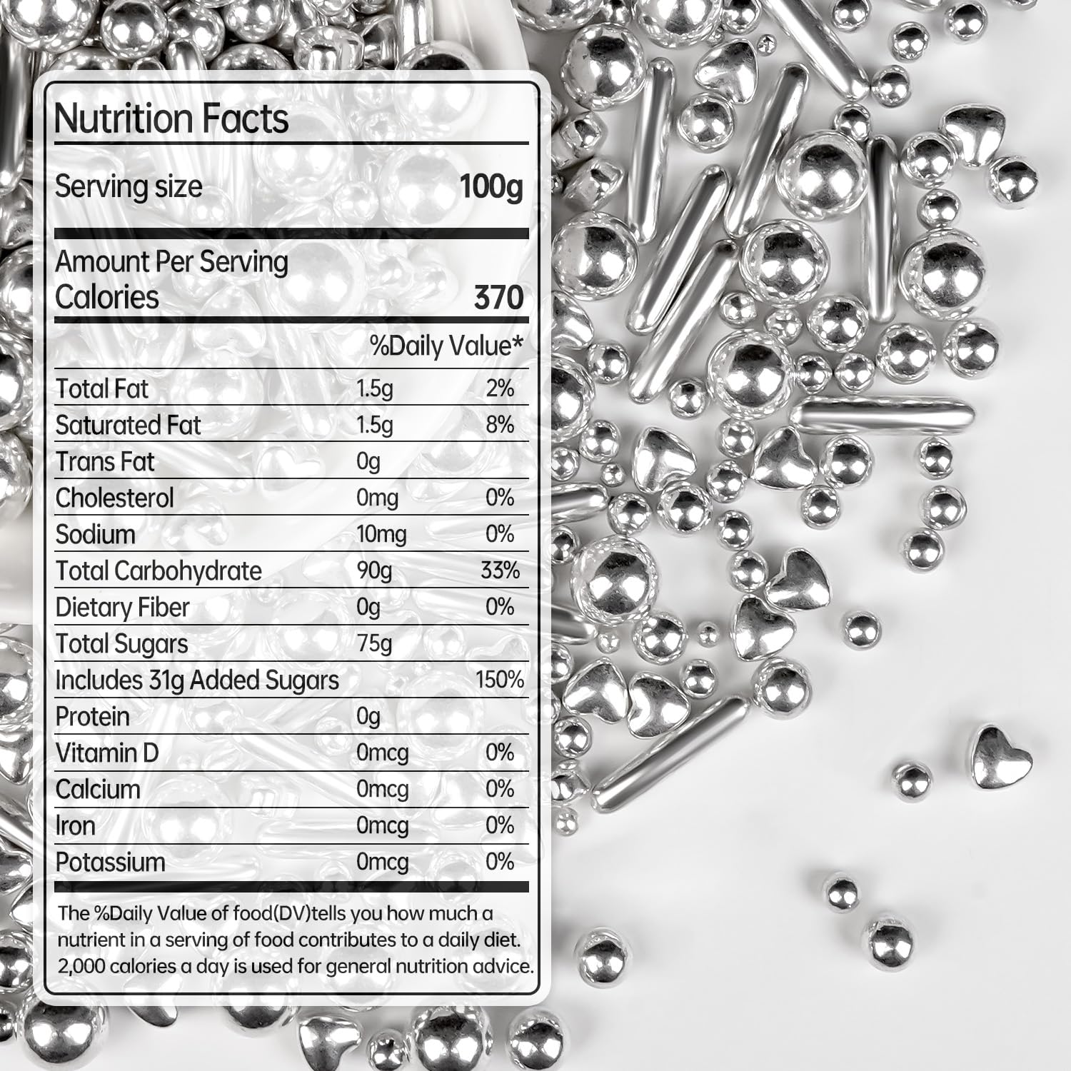 - Silver Pearl Rods Heart Sprinkles are a delightful addition to your baking and decorating collection. Net Weight: 150g/5.29oz. They are free of gluten, nuts, preservatives, dairy products, and any harmful chemicals.