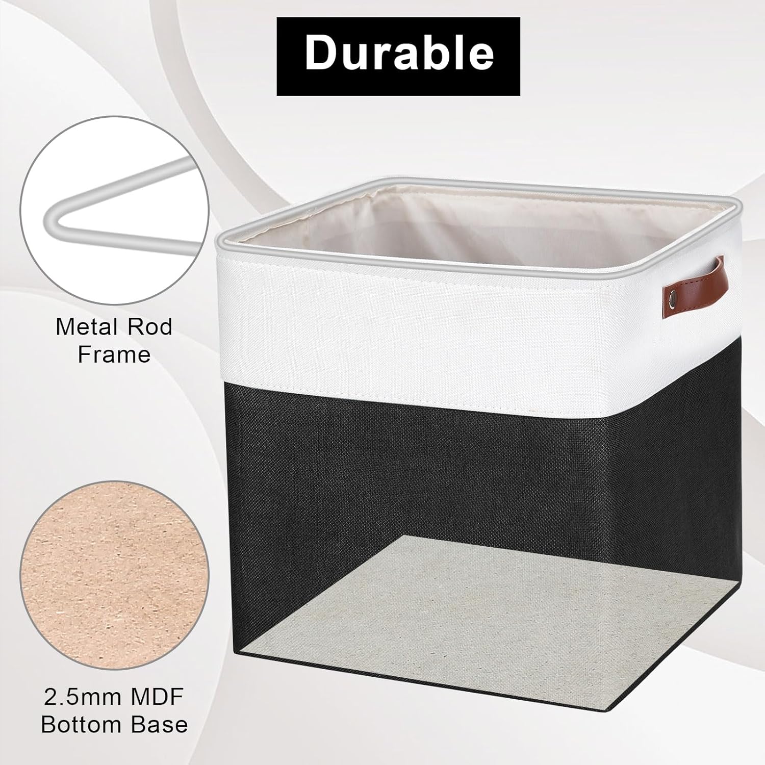 - 【Premium Quality】 - The closet organizer outside fabric is made of durable and attractive linen & thicken Environmental EVA, and used a lining material for the inside, handmade stitched. The sturdy metal rod frame around the top and 2.5mm MDF board in the bottom help to keep the storage bins in shape and provide max weight capacity up to 30lb. The sturdy leather handles make it easy to carry or pull off and out of shelves.