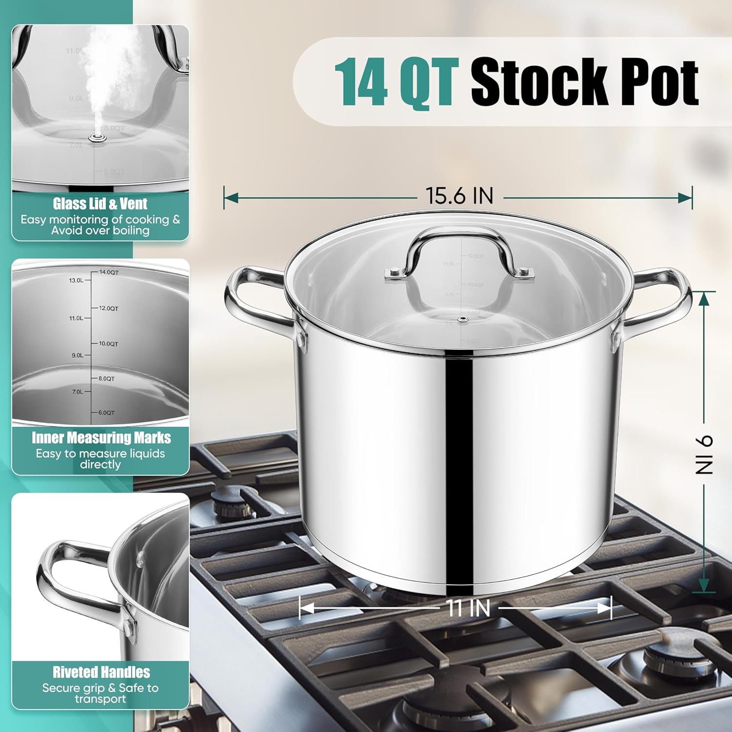 - 14QT STOCKPOT WITH MEASUREMENT SCALE: Measuring lines easy to know how much you making or help to choose a container for leftovers, Straight and deep side maximize space for water bath canning, or making a lot of soup/stew/chili/pasta/chicken/tomatoes for large group or special event like thanksgiving/gathering/Christmas