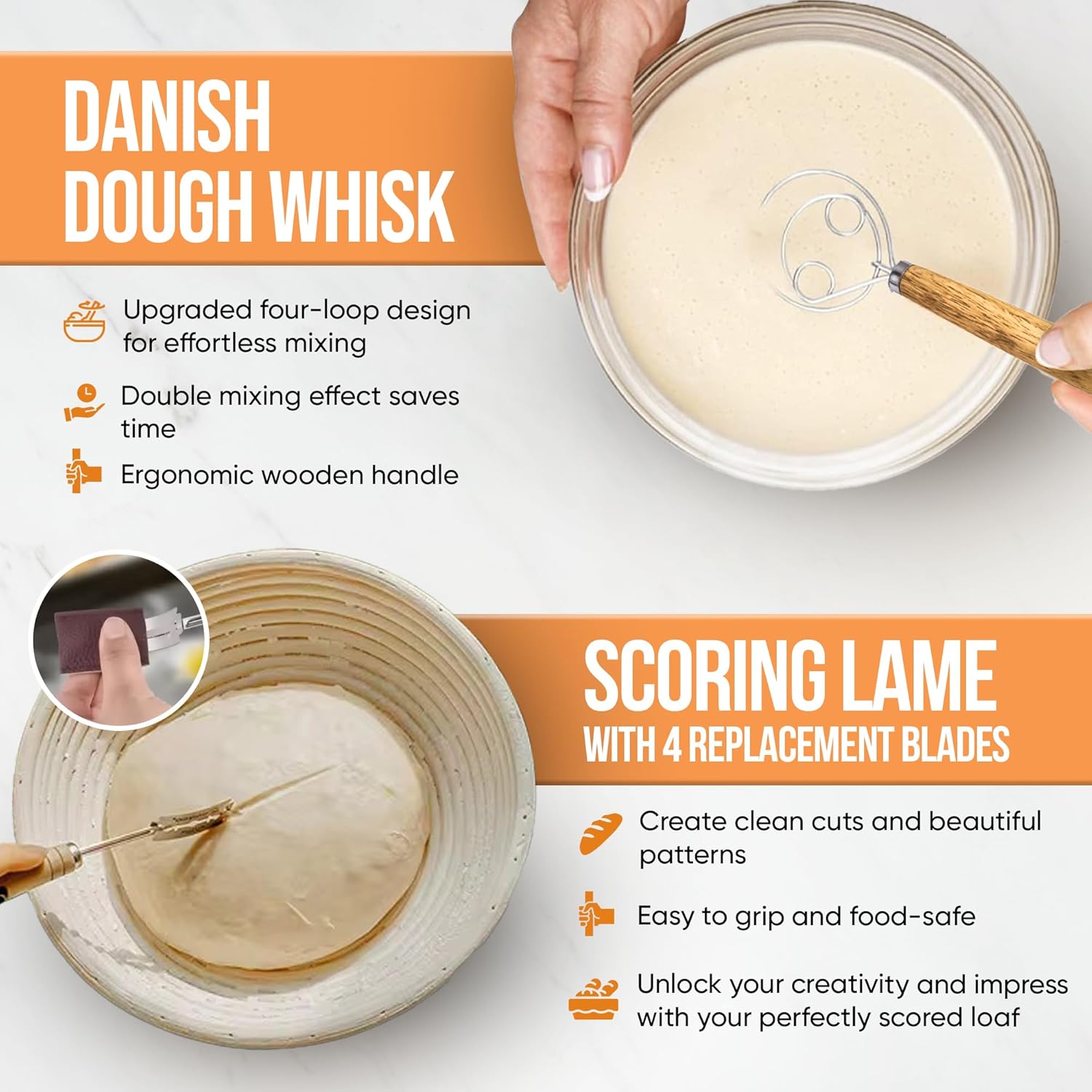 - CRUSTS THAT DAZZLE, FLAVORS THAT WOW – Made from premium natural rattan, our bread proofing basket helps your dough achieve that professional-grade crust. Pair it with our included sourdough baking supplies to make loaves that look and taste incredible. Our Sourdough essentials kit includes a Round 9-inch Proofing Basket, Dough Whisk, Bread Lame with Blades, Brush, Flour Duster, Plastic Bowl Scraper, Bannton Liner, Metal Dough Scraper, and Recipe Book.