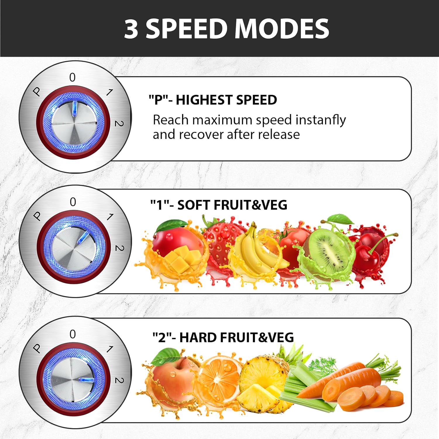 - 3 Speeds Mode: "1" low speed runs from 12000 to 15000 RPM for softer fruits like oranges, tomatoes and others; "2" fast speed runs from 15000 to 18000 RPM for harder fruits like carrots, celery, beets, kale and many others. “P” is the highest speed. (Reach maximum speed after release). Different juicing modes provide options for all produce