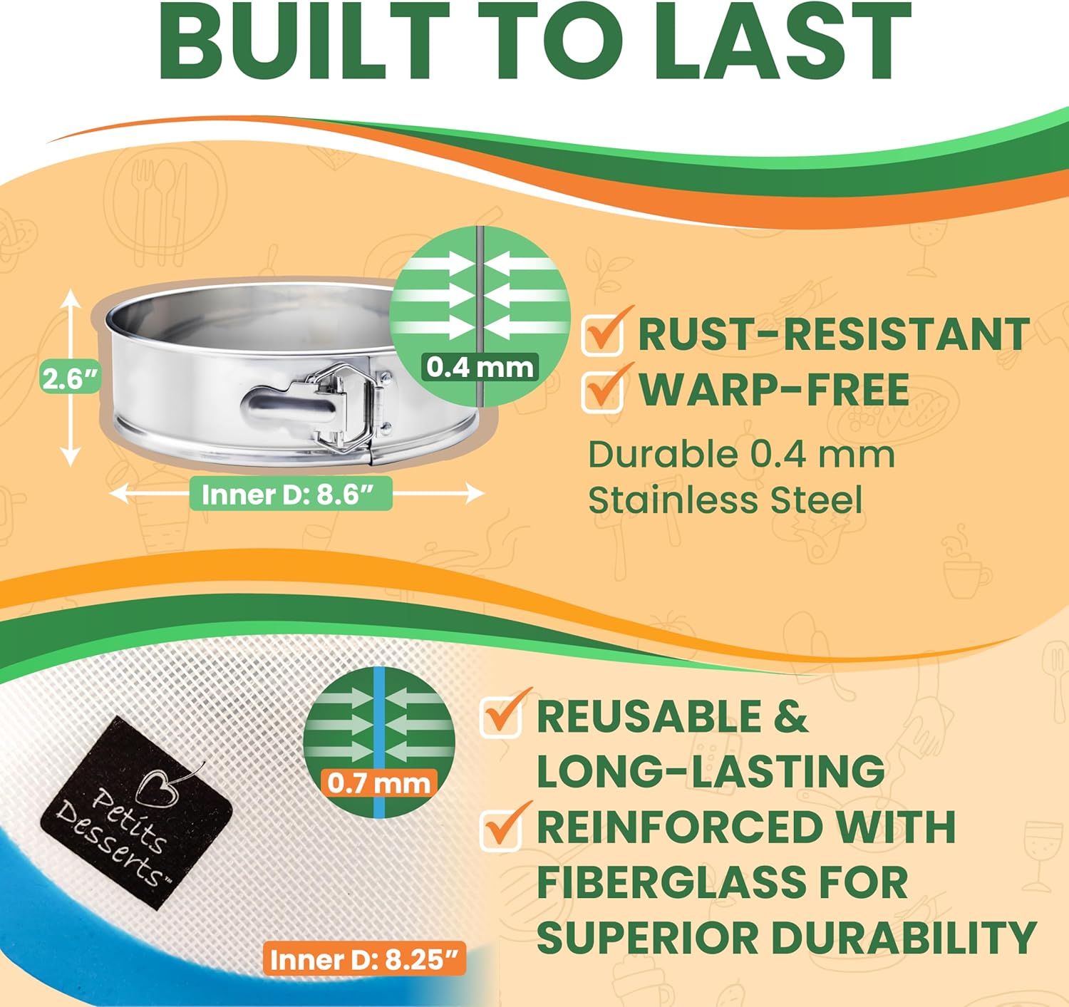 - 100% NON_TOXIC, NON-REACTIVE MATERIALS FOR SAFE, HEALTHY BAKING – Bake with confidence using our 304 stainless steel spring form pans 9 inch and food-grade silicone liner. Free from PFOA, PFOS, B.P.A., and lead, with our set, you can forget about the release of harmful chemicals into your food, ensuring a safe and healthy baking experience for you and your family.