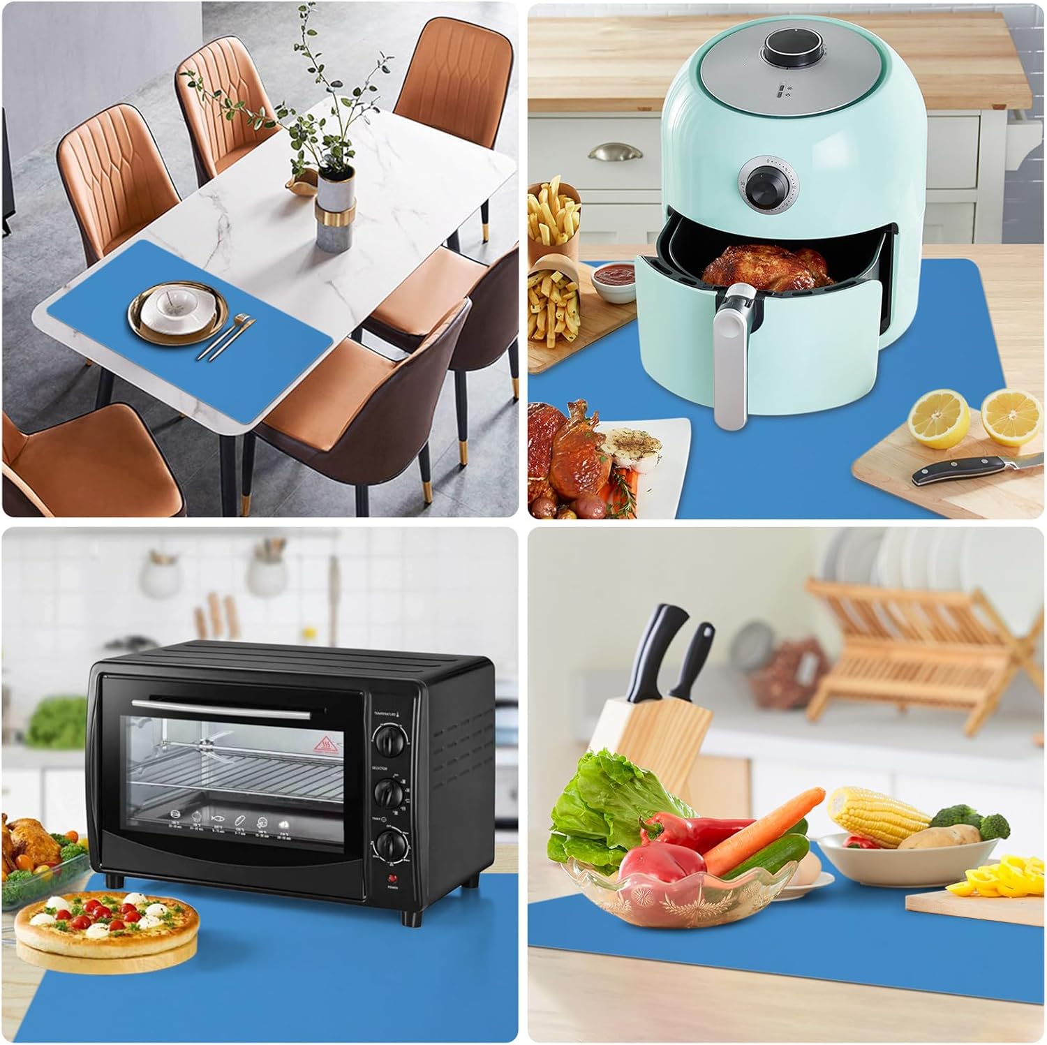 - Extra large silicone mat: Size of 36” x 24”, almost can fit most kitchen countertops, dining tables and other workbench. It can be placed under the air fryer, microwave, toaster oven, induction stove, coffee maker to protect the kitchen countertops and other surfaces against spills, scratches, grease, heat, etc. It’s cuttable to fit different sizes and shapes.