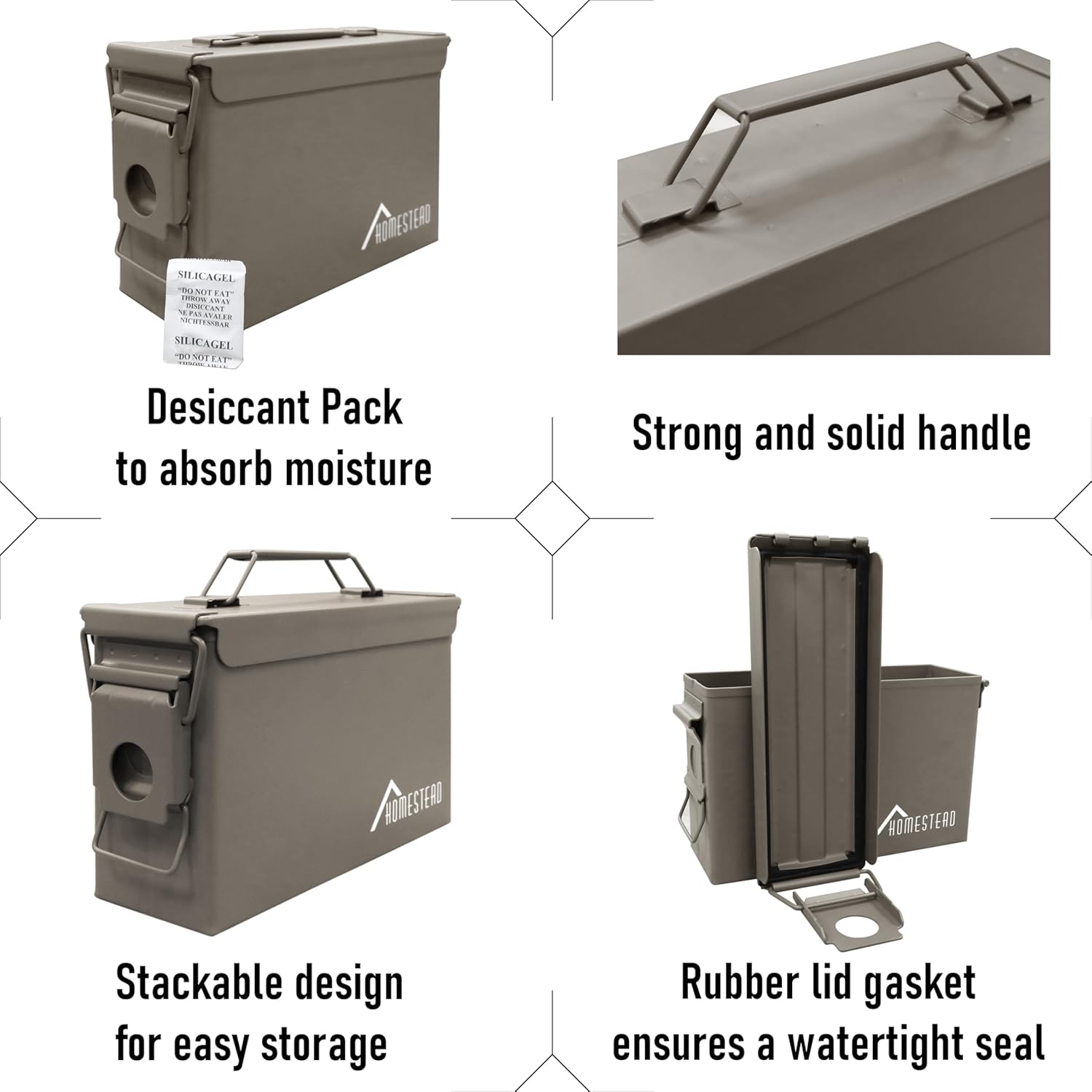 - Desiccant Pack Included - When you seal the ammo can shut, moist air trapped inside the can harm your belongings. A desiccant pack will absorb all that moisture and keep your things safe