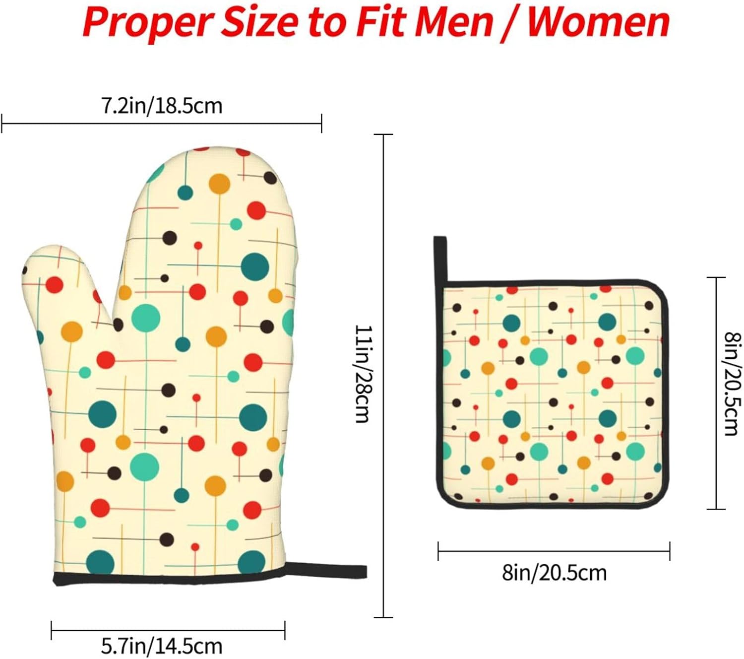 - Size: Kitchen oven gloves measure 7.2 x 11 inch and hot pads measure 8 x 8 inch