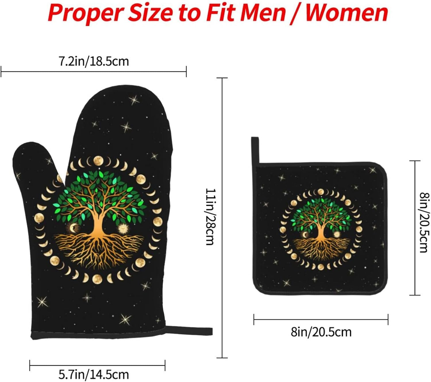 Black Oven Mitts and Pot Holders Sets of 3 Heat Resistant Hot Pads Ancient Life Tree Decorative Oven Gloves for Cooking Grilling Baking Kitchen Moon Luna Hippy Decor