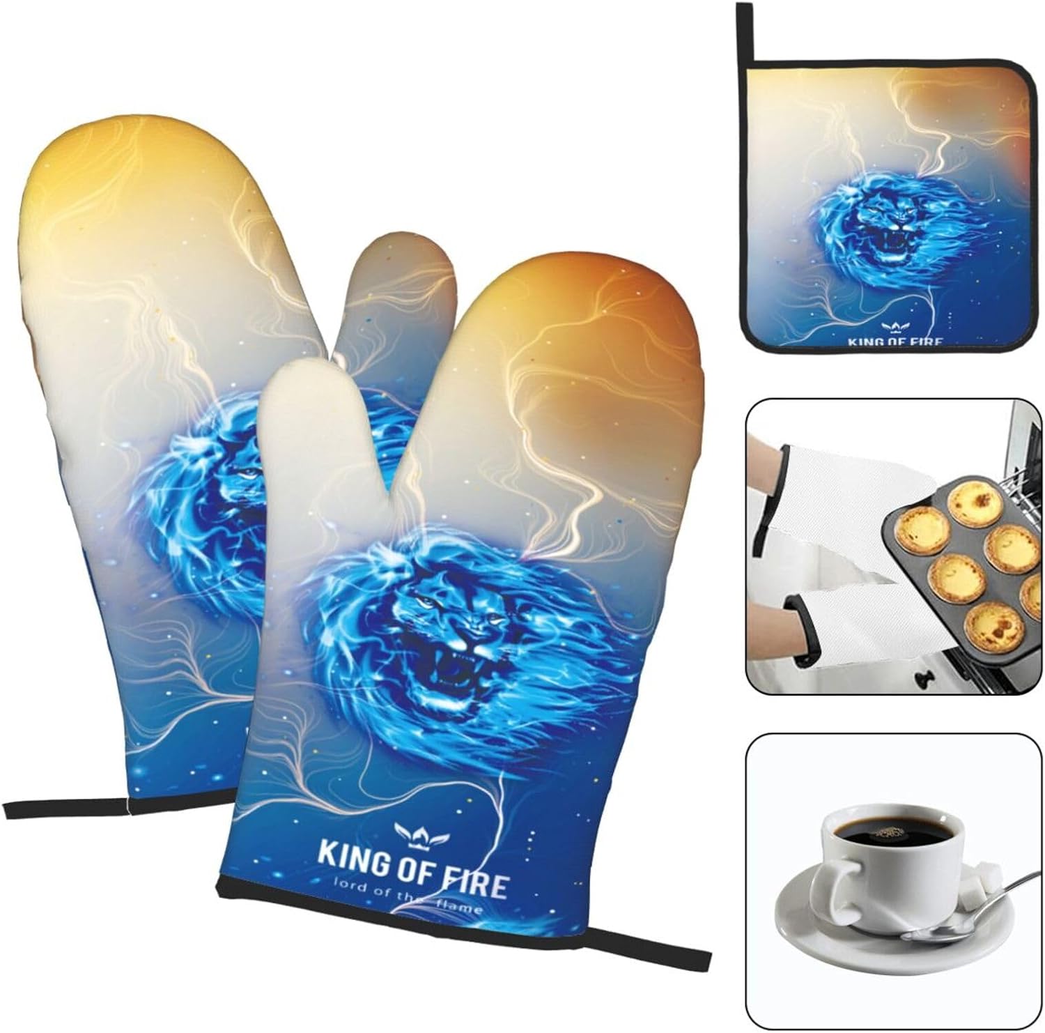 - Material: Lion oven mitts and pot holders sets include 2 baking gloves and 1 pot pads. Kitchen decor oven mitts are made of heat resistant polyester fabric, soft quilted cotton lining making, non-slip, heat resistant