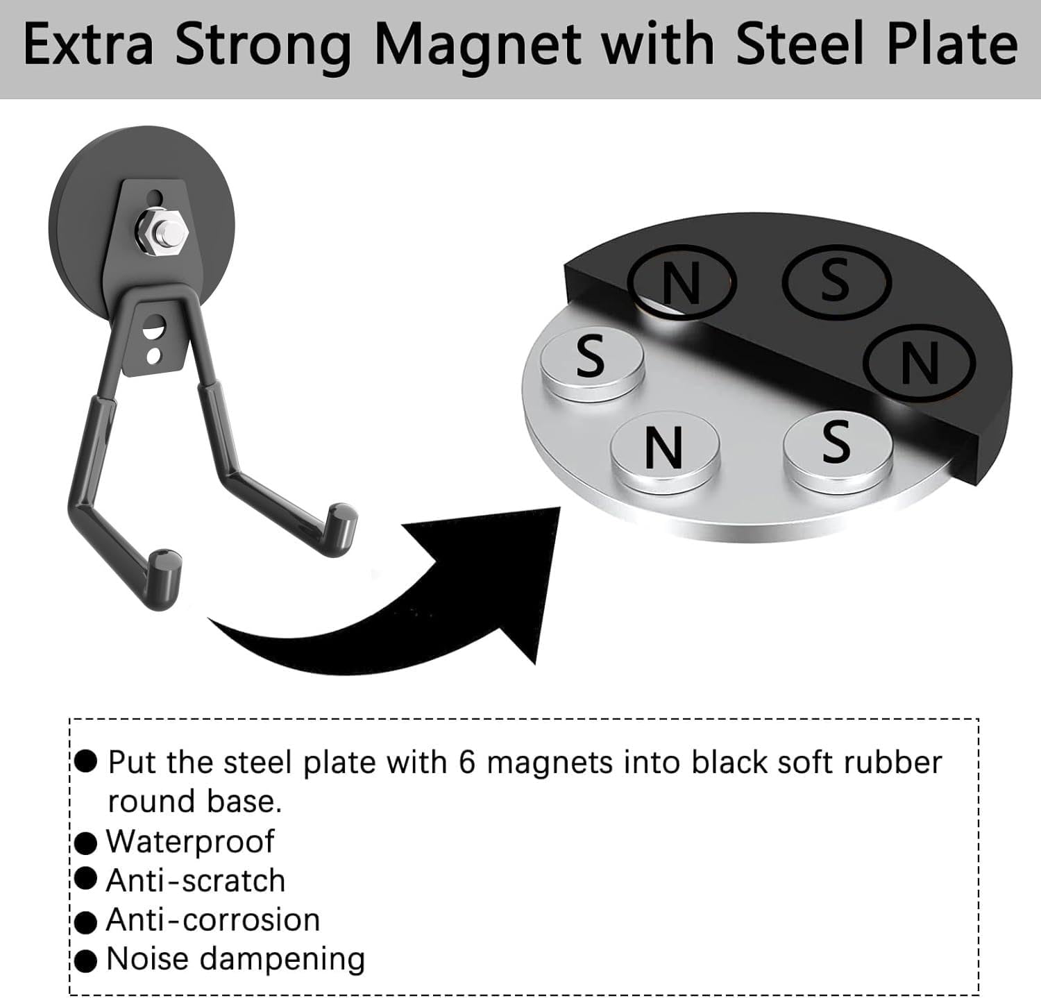- 🧲[Large Storage Magnetic Hooks]:These magnetic hooks includes 4 (2.6inch) strong magnet base with threaded bar, spacers,nuts and 4 PVC coated medium L hooks. We tested that our medium L magnetic hook can hold any kind of EV charger,more than one gallon bottled water, any kind of garage tool,drill, toolbox etc.