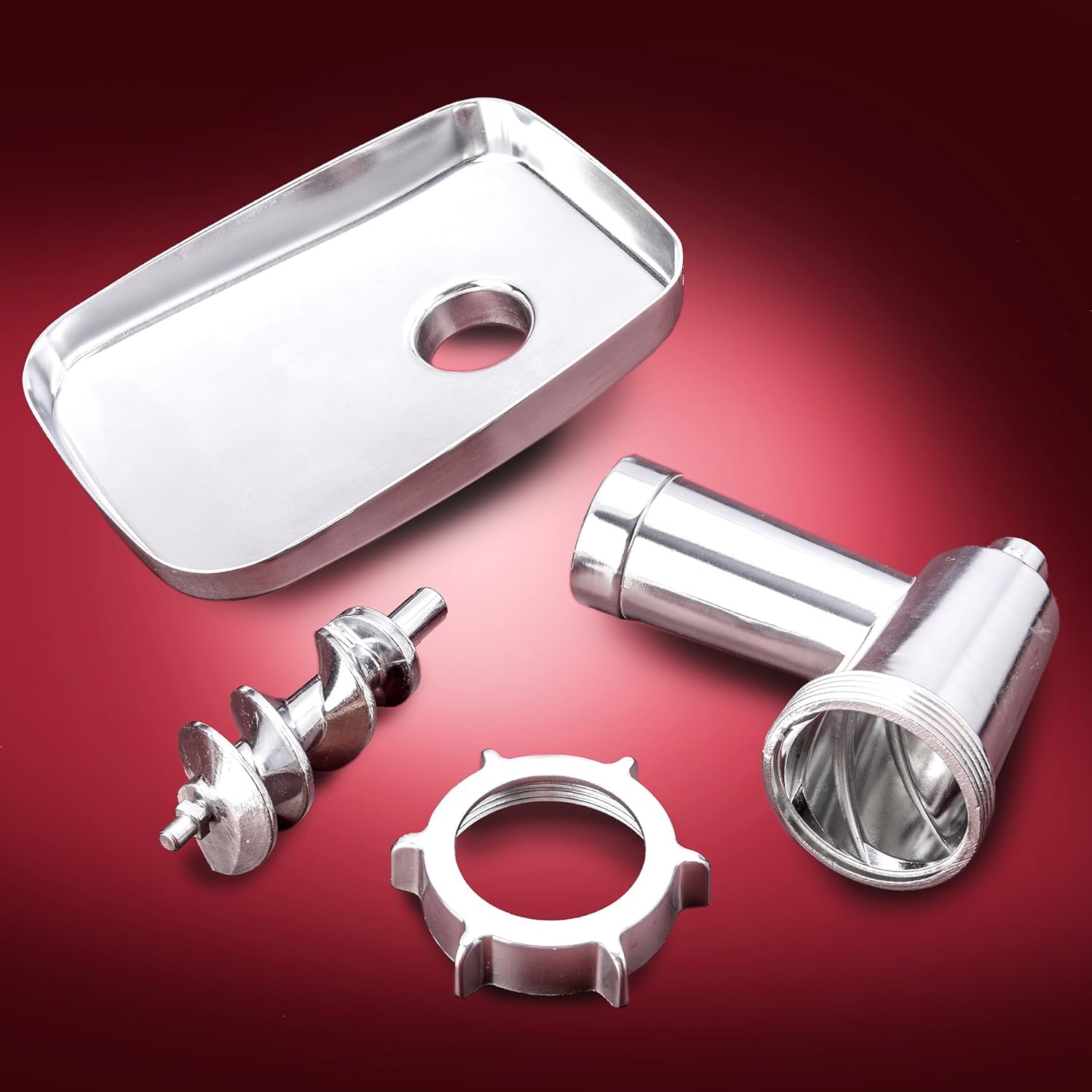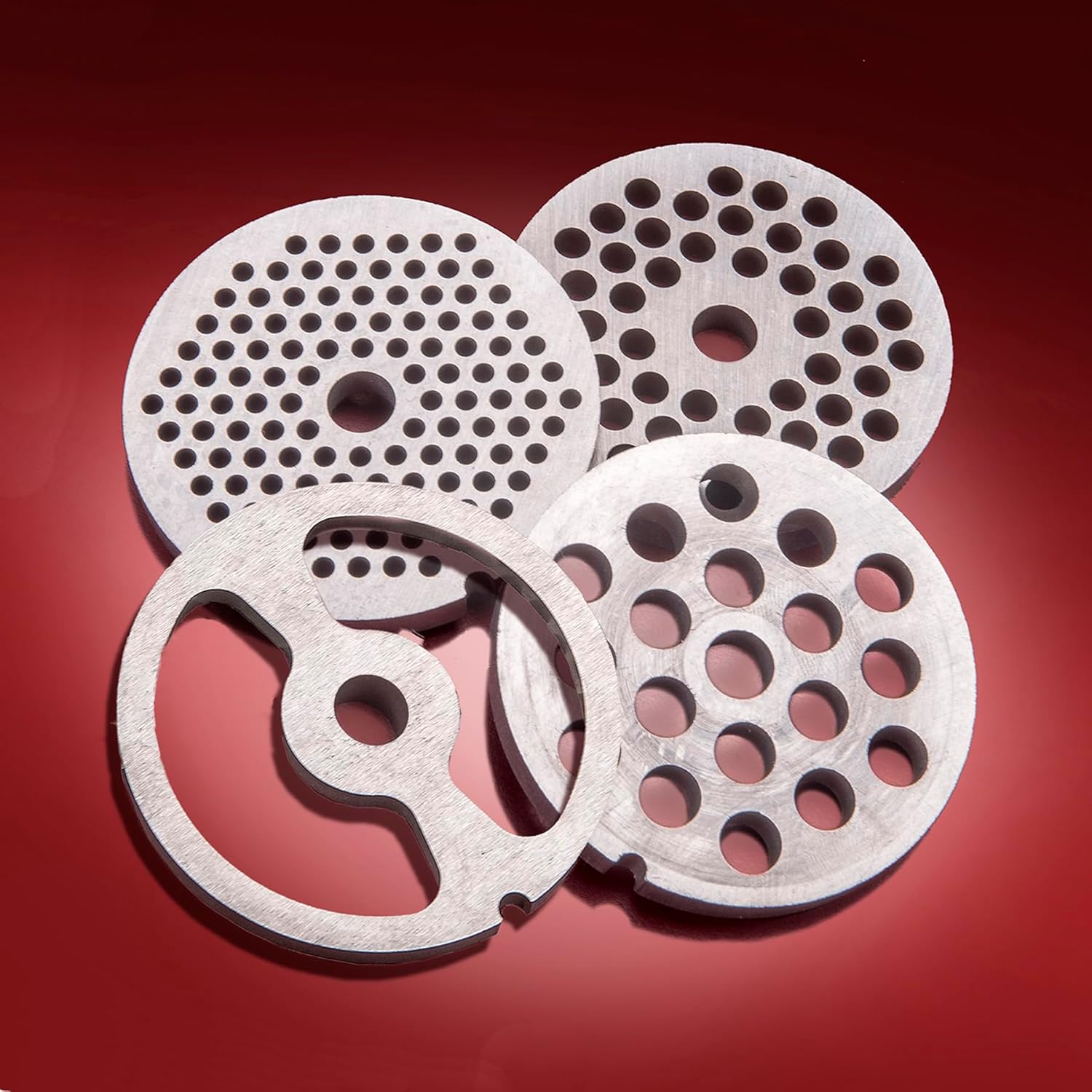 - The Turboforce Cadet 2000 Series Complete Kit Includes: 1-Size #8 Polished Aluminum (Not Coated) Grinding Head and Meat Feed Tray, 3 - 304 Grade Stainless Steel Quad Beveled Cutting Blades, 4 - Sizes of Grinding Plates (Includes 1 Sausage Stuffing Plate), 3 Sizes of Sausage Stuffing Tubes (1/2", 5/8" & 3/4"), 1 - Kubbe/Kibbe Making Attachment, 1 - Meat Pusher/Stuffer, 2 Meat Shredder Claws & a Burger-Slider Patty Maker Press.
