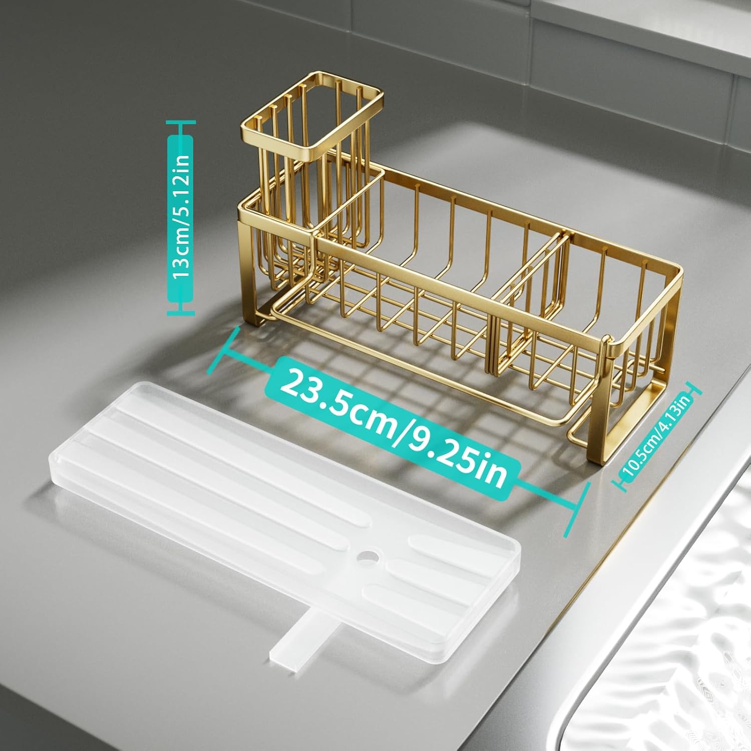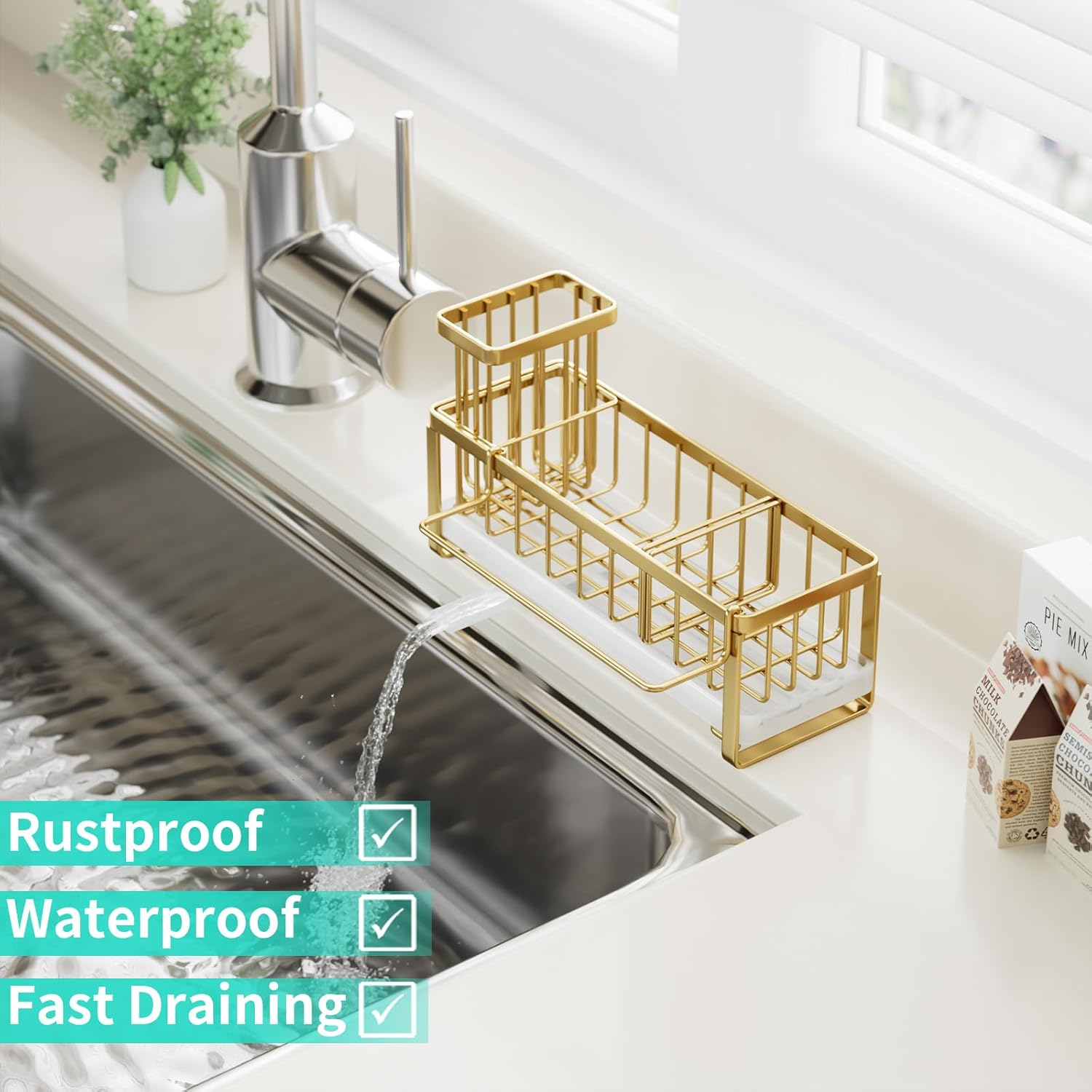 HapiRm Sponge Holder for Kitchen Sink - Self-draining Sink Caddy with Brush Holder and Dishcloth Holder, Stainless Steel Kitchen Organizer for Countertop - Gold
