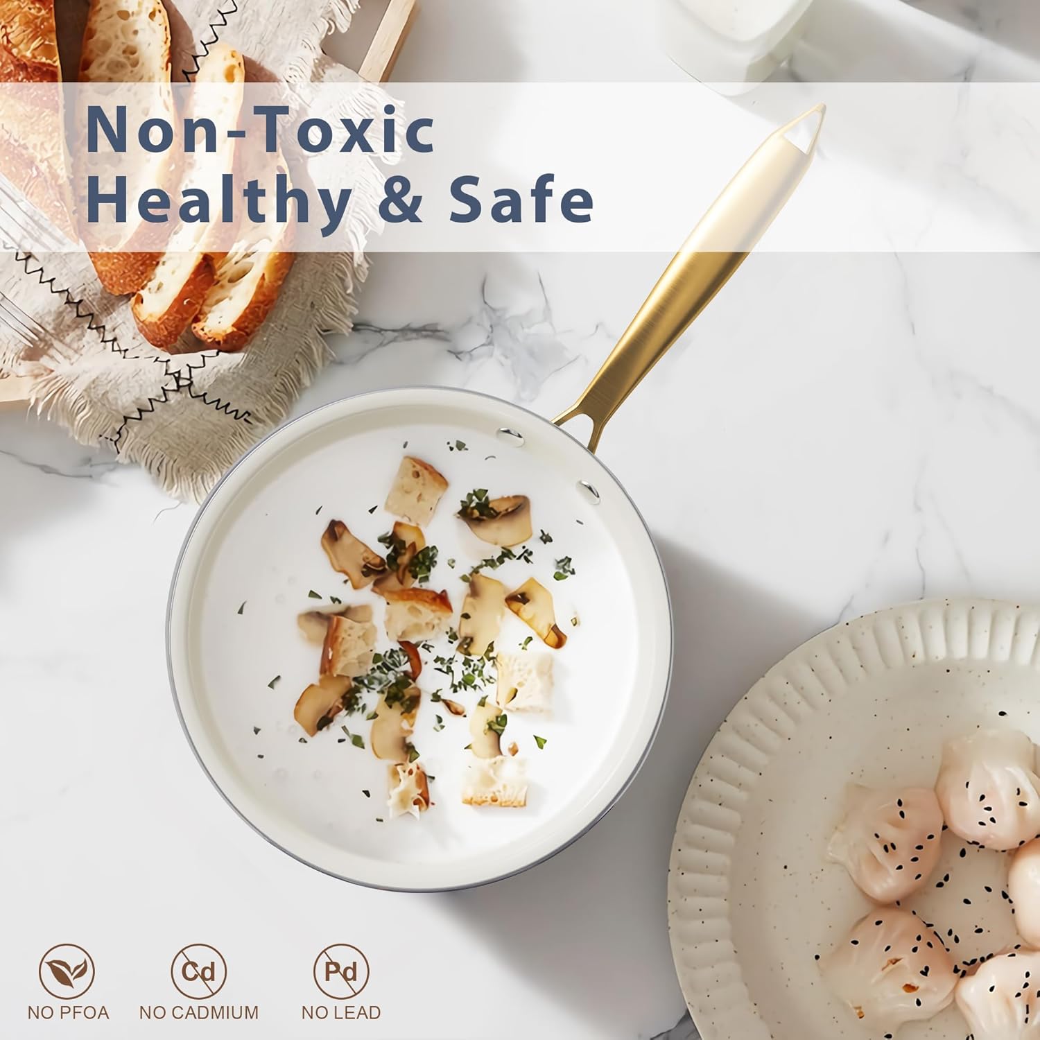 - 【Non Toxic Ceramic Coating】- Ceramic pots and pans set nonstick are free of PTFE, PFOA, PFAS, lead, cadmium and other toxic materials, 100% safe for you, your family, and the environment