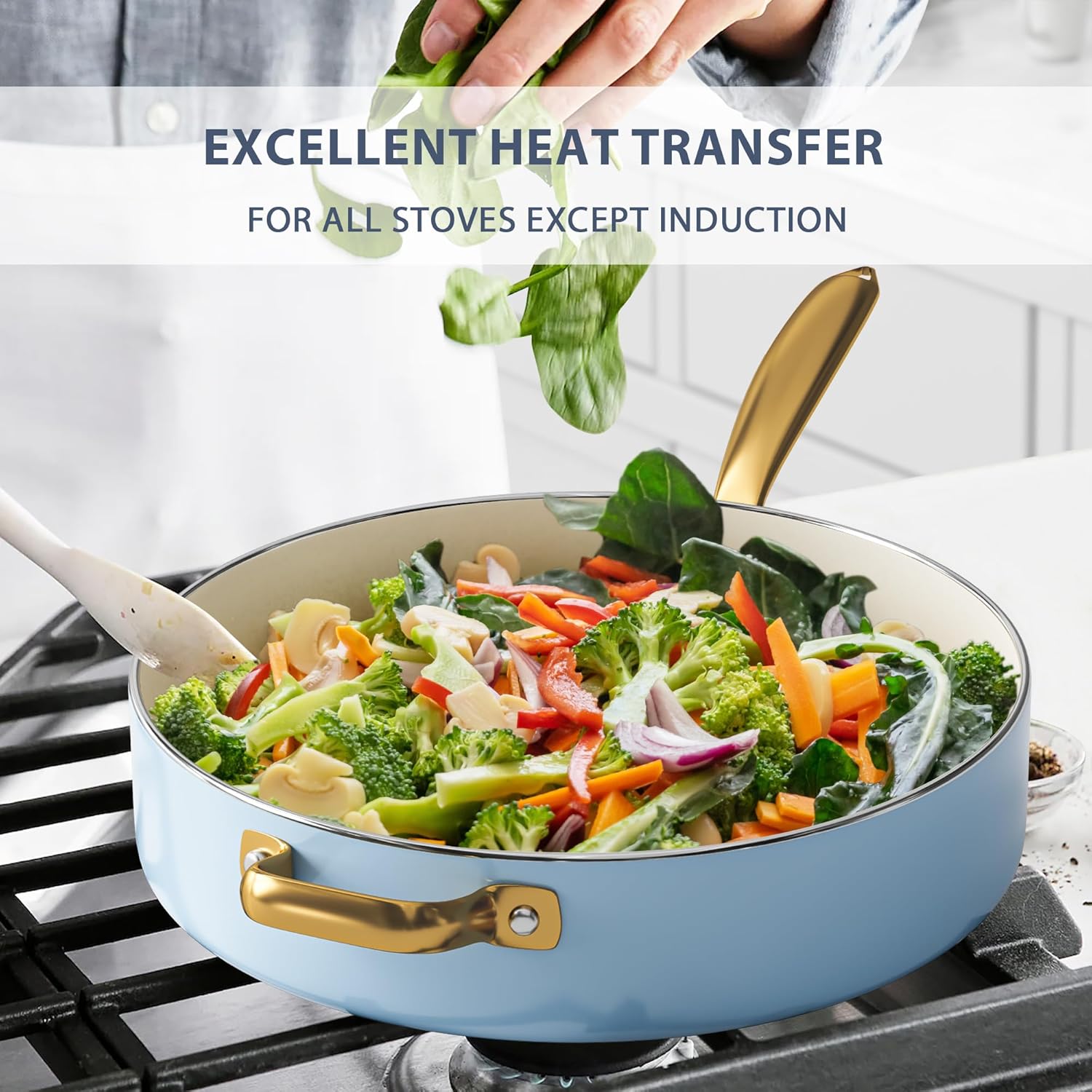 - 【For all Stovetops Except Induction】- The nonstick cookware set does not have a magnetic induction bottom, which allows faster heating on other cooktops, saving time and energy. Oven safe up to 550°F